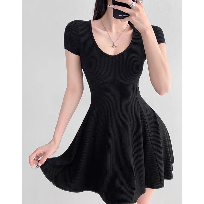 rib knit v-neck five-point sleeve flare mini dress la1593