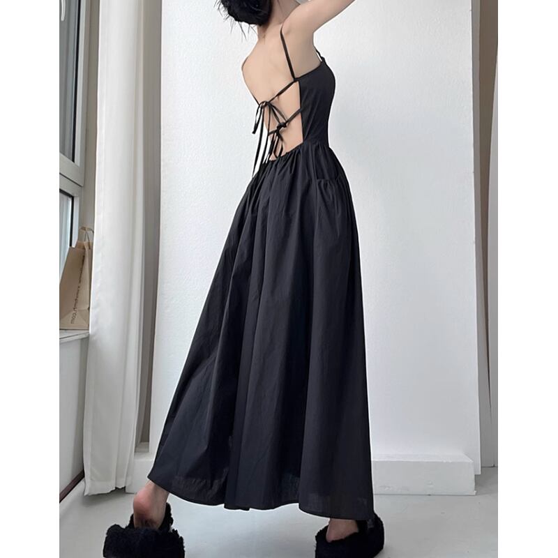 バックオープンデザインが魅力的なマキシ丈ワンピース。