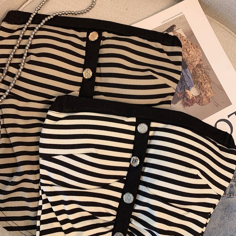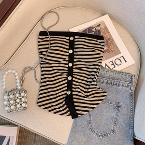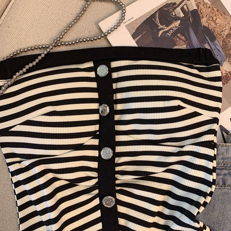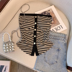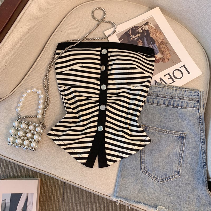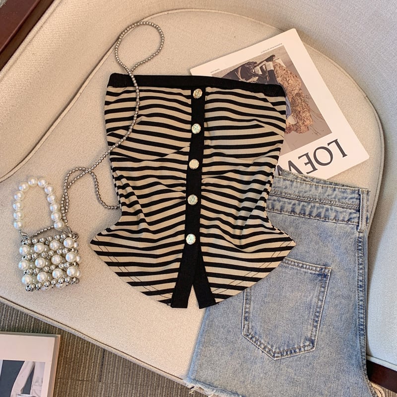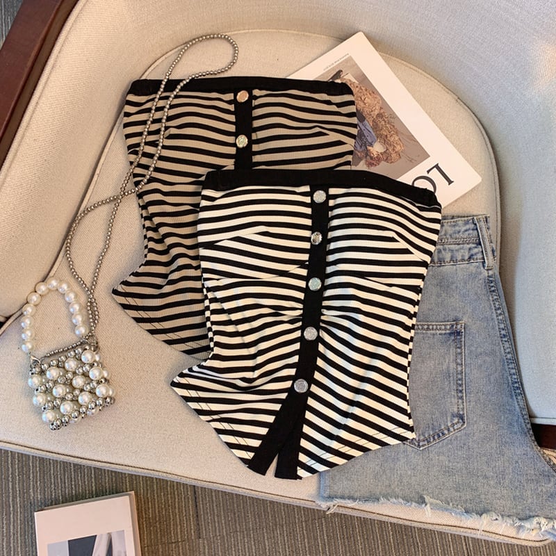 フロントボタンとストライプ柄が特徴的なチューブトップ。シンプルながらも洗練されたデザインで、様々なスタイルに合わせやすいアイテムです。ボトムスを選ばず、カジュアルにもきれいめにも着こなせるので、ワードローブに1枚加えておくと重宝すること間違いなしです。 【サイズ】 S:バスト68cm/着丈36cm M:バスト72cm/着丈37cm L:バスト76cm/着丈38cm 【カラー】 ・ブラック ・ブラウン 【モデル】 身長:163cm 体重:45kg B/W:83/58 着用サイズ:S *Lavissyで人気のアイテムはこちら♪ https://www.lavissy-fashion.shop/categories/2816592 *新商品入荷中!/SALE情報をcheck https://www.lavissy-fashion.shop/ **ご購入前に必ずお読みください** https://www.lavissy-fashion.shop/blog/2020/07/05/231434 【お届けについて】 こちらの商品は海外店舗より直接発送となる為、 ご入金から10日〜3週間前後で発送致します。 ◆注意事項 ・タイミングによっては 商品在庫切れにより 注文キャンセルとさせていただく恐れもございますので、予めご了承くださいませ。 ・こちらは輸入品となります。日本製とは検品基準が異なる為、 新品未使用品でもごくわずかな汚れや ほつれがある場合もございます。 ・仕入れ工場を変えることがあるため、記載サイズと若干異なる場合がございます。 ・商品の色味は、お手持ちのスマートフォンの画面によって実物と若干異なる場合がございます。 ・イメージ違いやサイズ交換等、お客さまご都合による交換、返品は対応出来かねます。 【お支払方法】 ・クレジットカード決済 (VISA/Master/JCB/AMERICAN EXPRESS) ・キャリア決済 (docomo/au/SoftBank/Y!mobile/UQmobile) ・後払い決済 ーーーーーーーーーーーーーーーーーーーー *Lavissy Instagram https://www.instagram.com/lavissy_official