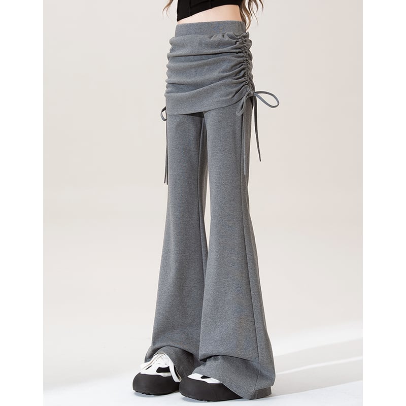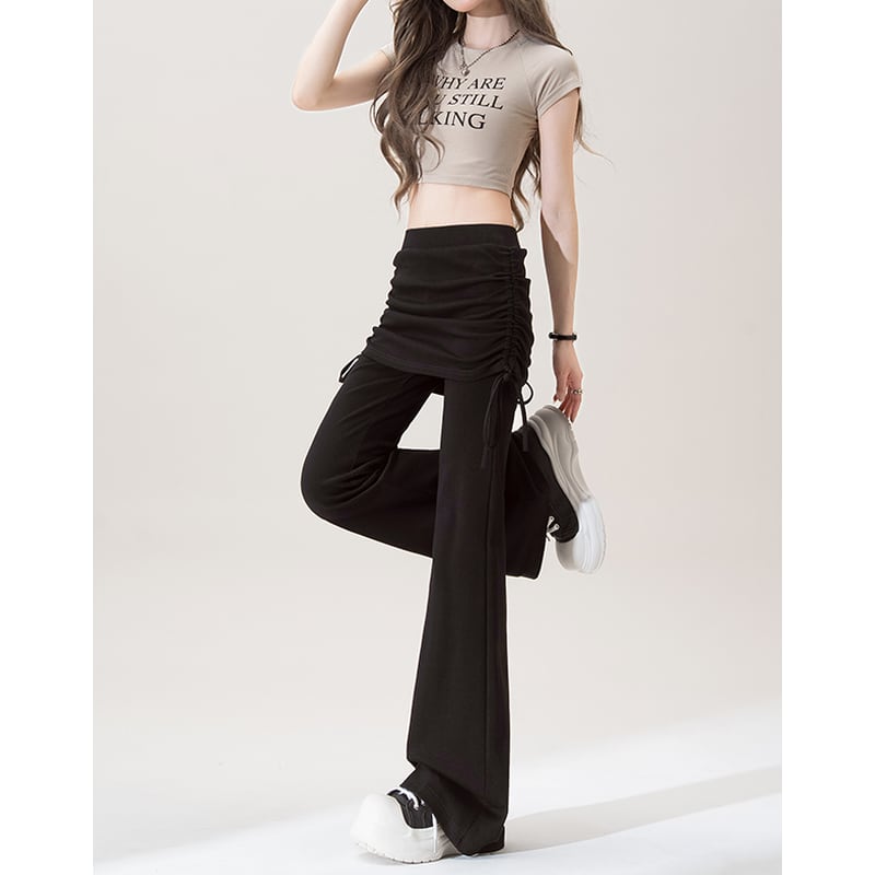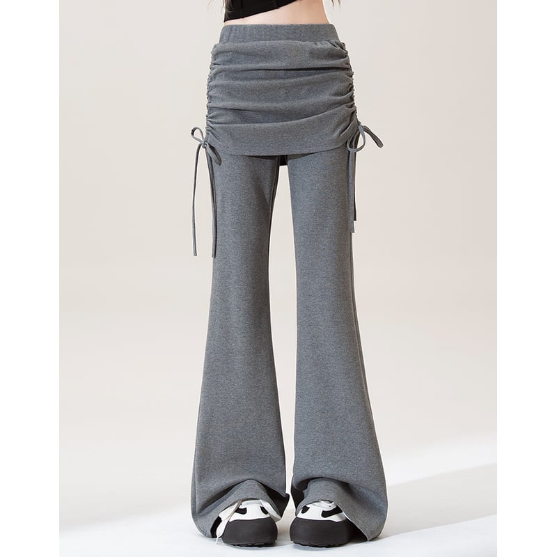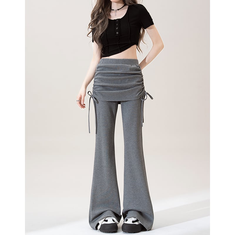 ハイウエストデザインとフレアシルエットが魅力のパンツ。ウエスト部分はシャーリングデザインになっており、スタイルアップ効果も期待できます。サイドの紐でシルエットを調整できるのもポイント。カジュアルなスタイルから、きれいめなスタイルまで幅広く活躍します。普段使いはもちろん、お出かけにもおすすめです。