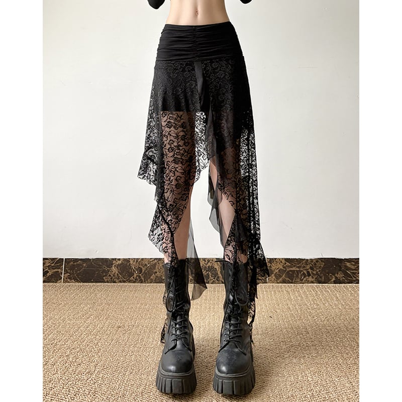 裾が大胆にアシンメトリーになった、ゴシックレースのハイウエストフレアスカート。シアーな素材感が、女性らしい透け感とミステリアスな雰囲気を演出します。ウエストはゴム仕様で、快適な履き心地。普段使いから特別な日のお出かけまで、幅広いシーンで活躍するアイテムです。