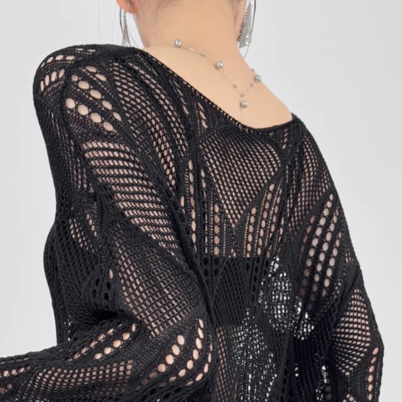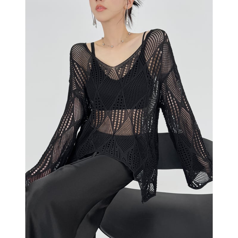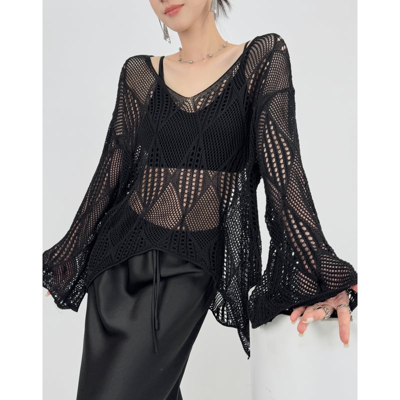 ゆったりとしたシルエットが魅力のニットプルオーバー。Vネックデザインがデコルテを美しく見せ、抜け感のある着こなしを演出します。透かし編みの繊細なデザインが、女性らしさを際立たせます。デイリーユースから、ちょっとしたお出かけまで幅広いシーンで活躍します。