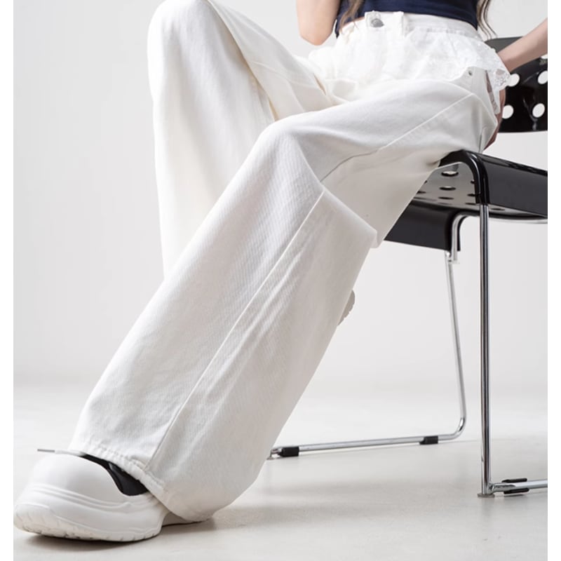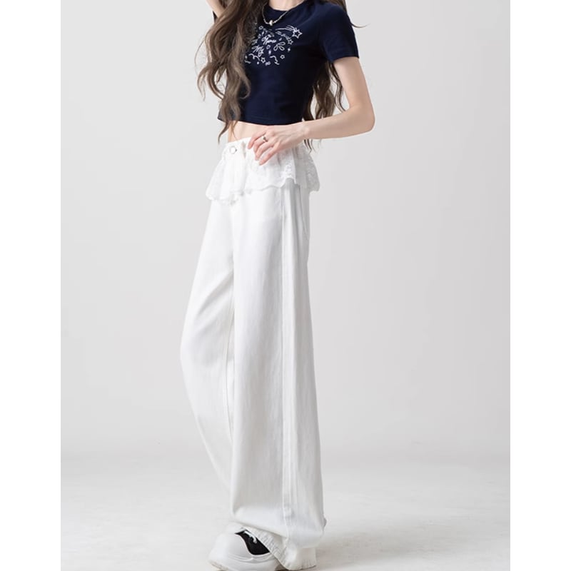 ハイウエストデザインとワイドレッグシルエットで、体型カバーとスタイルアップを両立したパンツ。ウエスト部分にあしらわれた繊細なレースが、さりげない可愛らしさをプラスします。普段使いはもちろん、お出かけスタイルにも最適です。