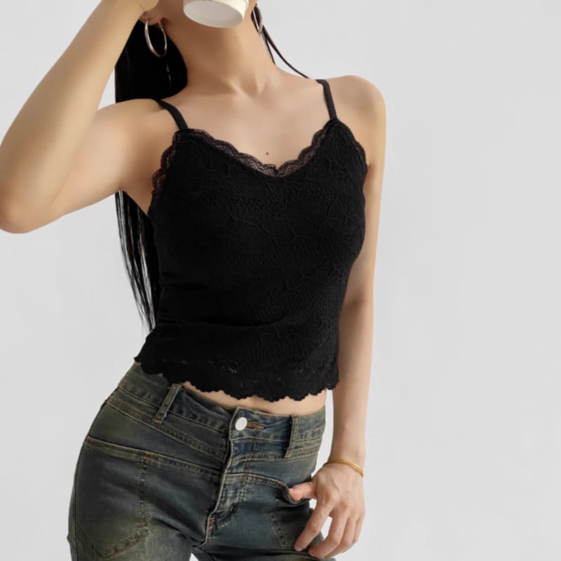 繊細なレースが美しいキャミソール。Vネックのデザインが女性らしさを引き立て、デイリーユースから特別な日のおしゃれまで幅広く活躍します。一枚で着ても、レイヤードスタイルにも最適です。