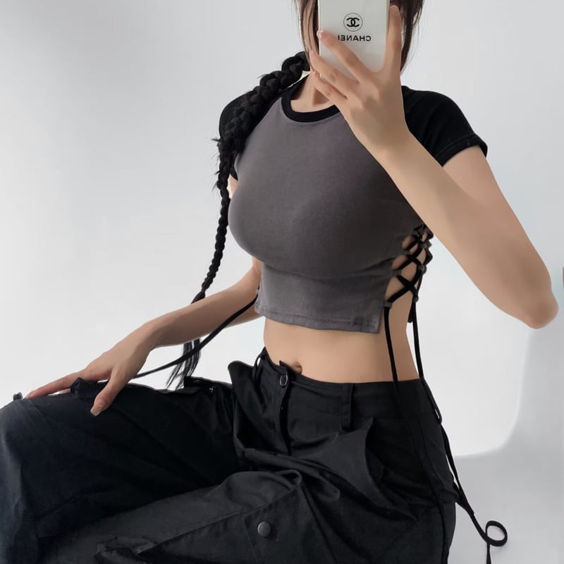 二色使いのレースアップデザインが魅力的なクロップドトップ。肌触りの良い生地で着心地も抜群です。サイドのレースアップでウエストを絞ることで、スタイルアップ効果も期待できます。カジュアルなスタイルからフェミニンなスタイルまで幅広く合わせやすく、デイリーユースに最適なアイテムです。