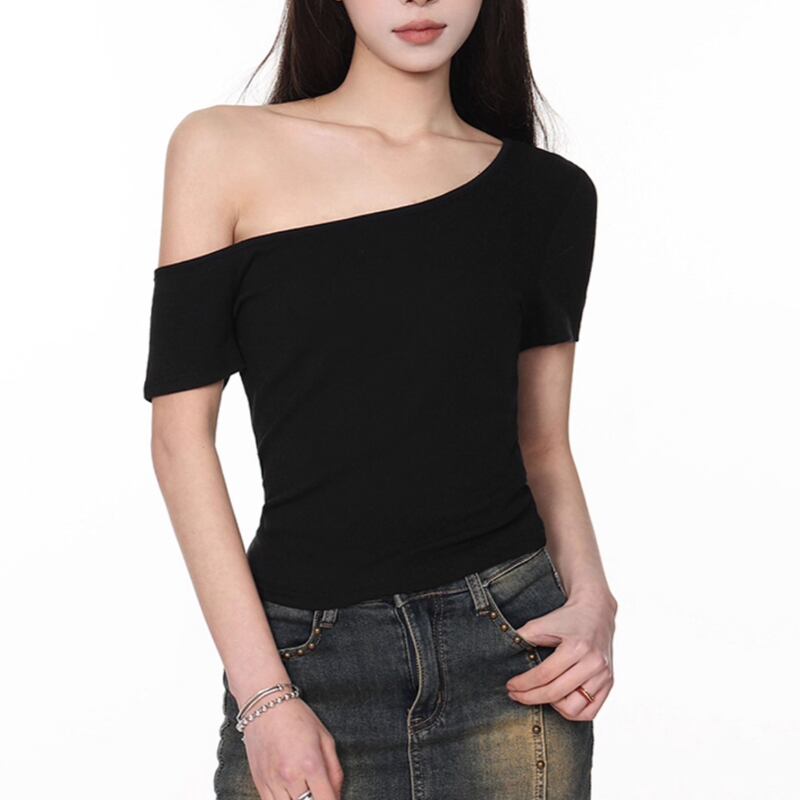 スタイリッシュなハンチング帽と、アシンメトリーなネックラインが魅力のショートスリーブトップスのコーディネート。ハンチング帽は、さりげなく施されたスタッズがアクセントになり、カジュアルながらも洗練された印象を与えます。トップスは、片方の肩を落としたデザインが女性らしさを演出。シンプルながらも個性的で、様々なボトムスと合わせやすいアイテムです。デイリーユースから、お出かけスタイルまで幅広く活躍してくれるでしょう。