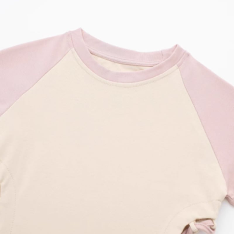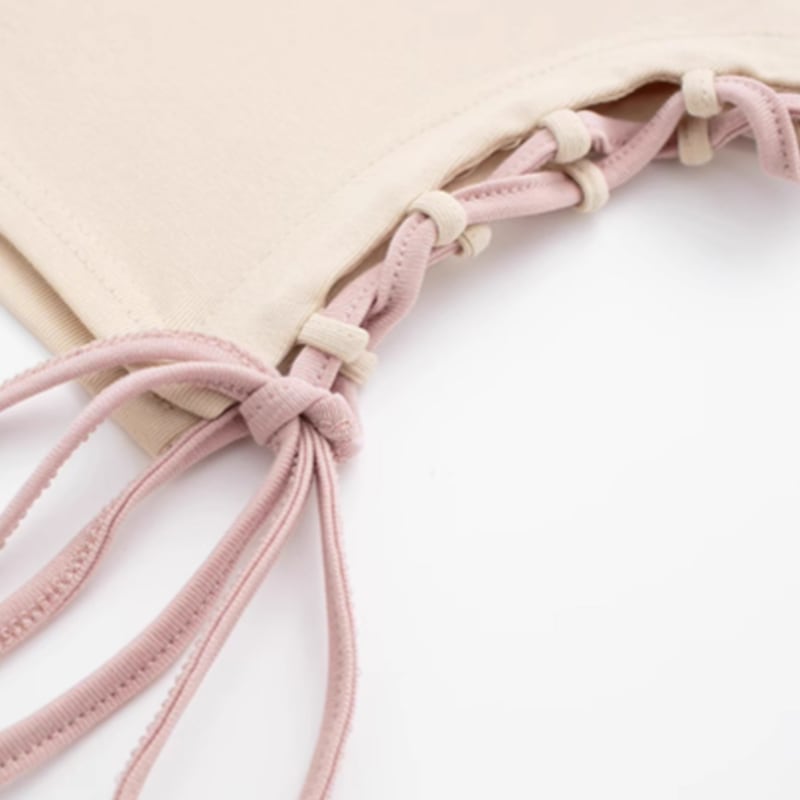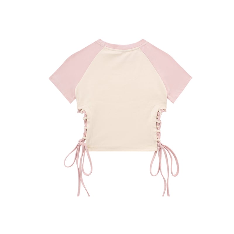 サイドに施されたレースアップがアクセントになったショート丈トップス。ラグランスリーブのデザインが、肩回りをすっきりとした印象に見せてくれます。シンプルなデザインなので、カジュアルなスタイルにも、フェミニンなスタイルにも合わせやすい万能アイテムです。様々なシーンで活躍できる、着回し力抜群のトップスです。