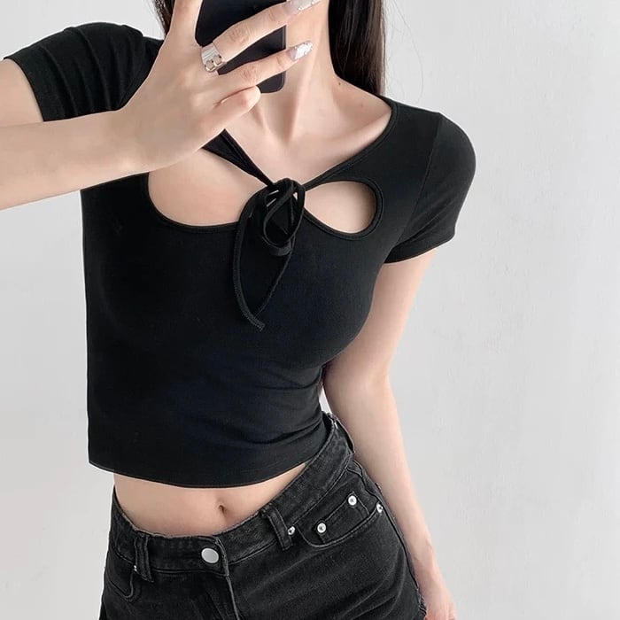 フロントのキーホールデザインとリボンが目を引く、フェミニンなショート丈トップス。