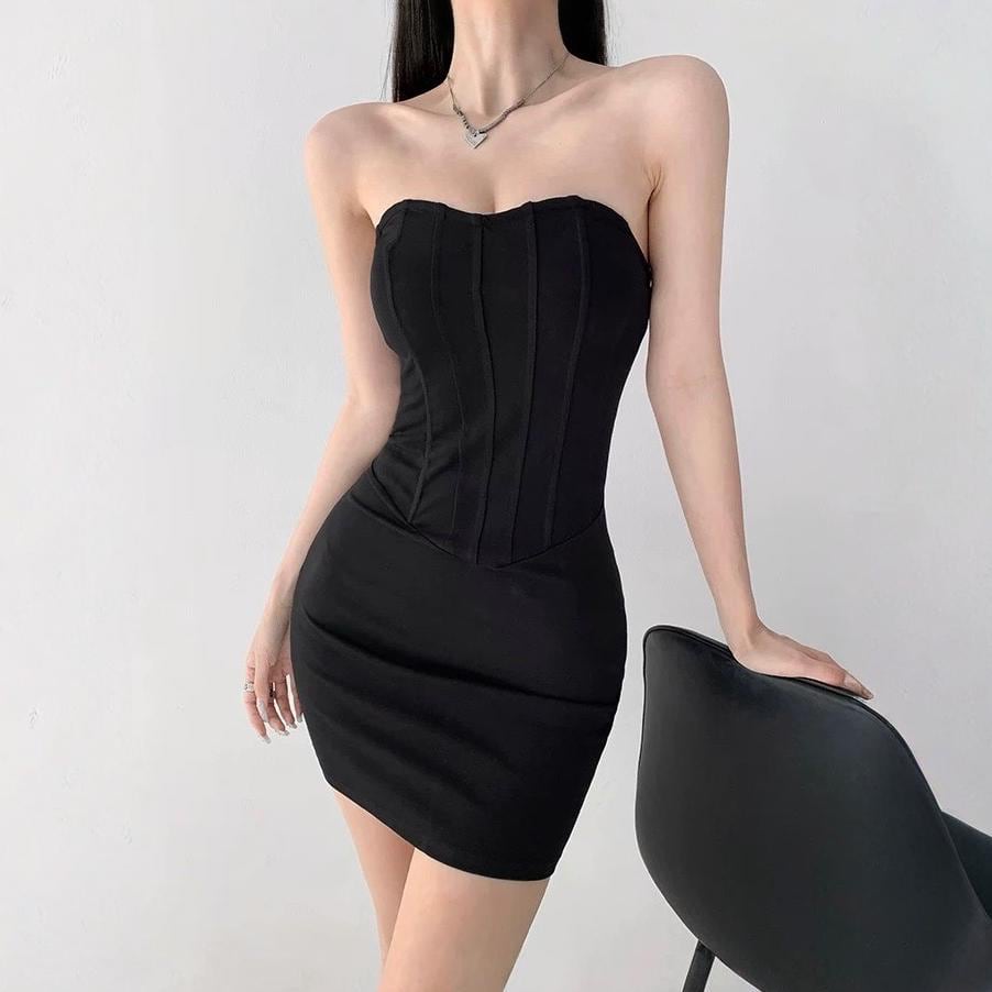 ストラップのないデザインがデコルテをきれいに見せてくれ、シンプルながら存在感のある一枚です。