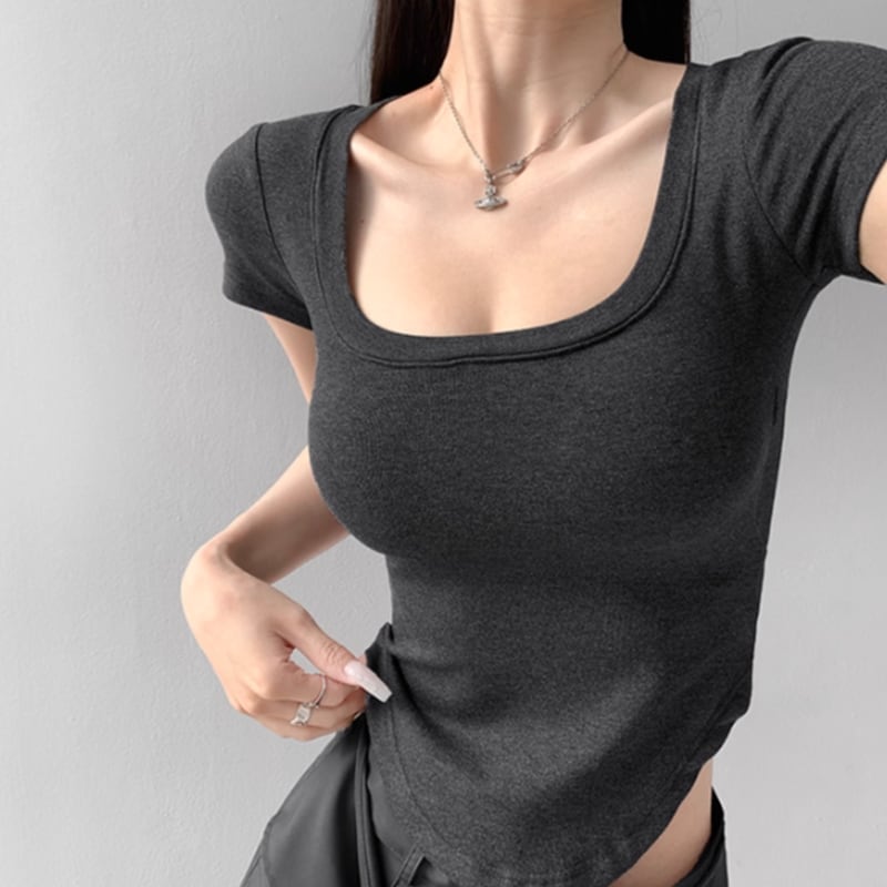 スクエアネックが女性らしい印象を与えるクロップド丈トップス。短めの袖丈とすっきりとしたシルエットで、どんなボトムスとも相性抜群です。カジュアルなスタイルからきれいめな着こなしまで幅広く活躍するアイテムです。デイリーユースにぴったりな一枚です。