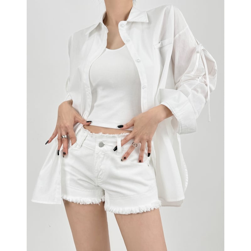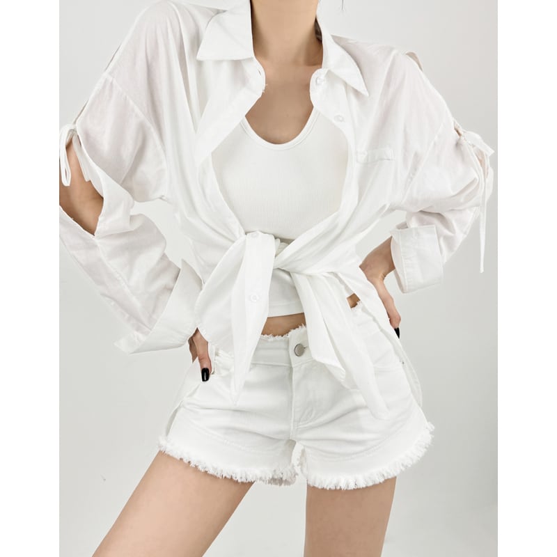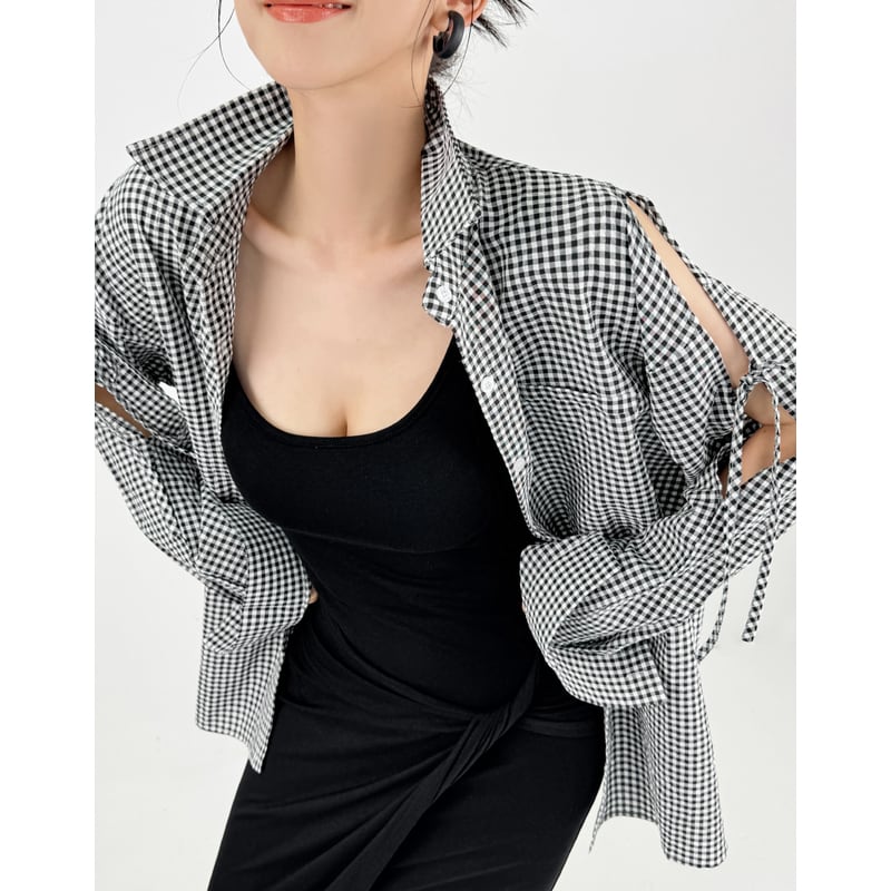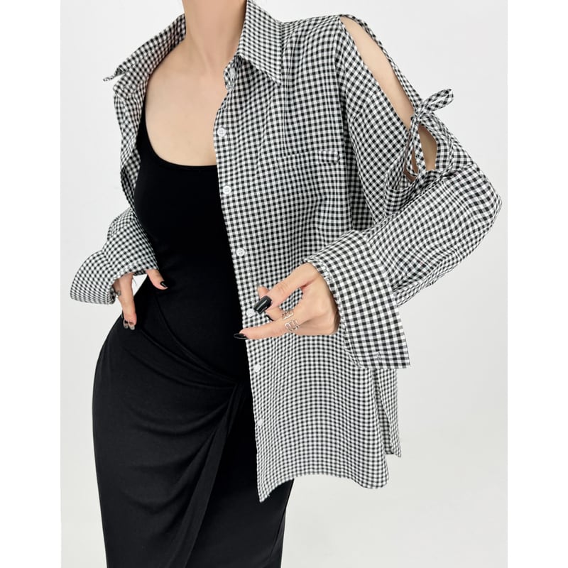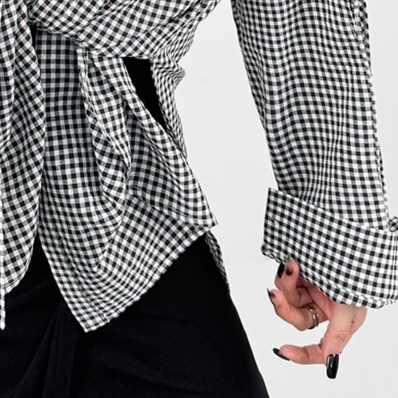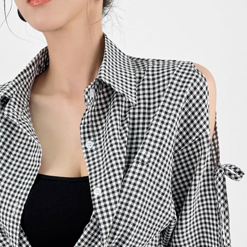 ロングスリーブのフロントタイデニムショートパンツは、肩が開いたデザインが特徴です。ギンガムチェック柄が爽やかで、カジュアルな中に上品さも兼ね備えています。普段使いから、ちょっとしたお出かけまで幅広く活躍してくれるアイテムです。デニム素材のショートパンツは、動きやすさも抜群。様々なスタイルに合わせやすく、着回し力も高いので、ワードローブに加えたい一着です。
