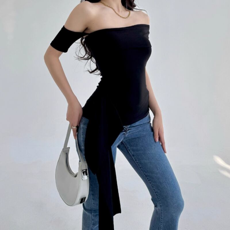 off-shoulder asymmetrical tight silhouette bodycon knit top la2076