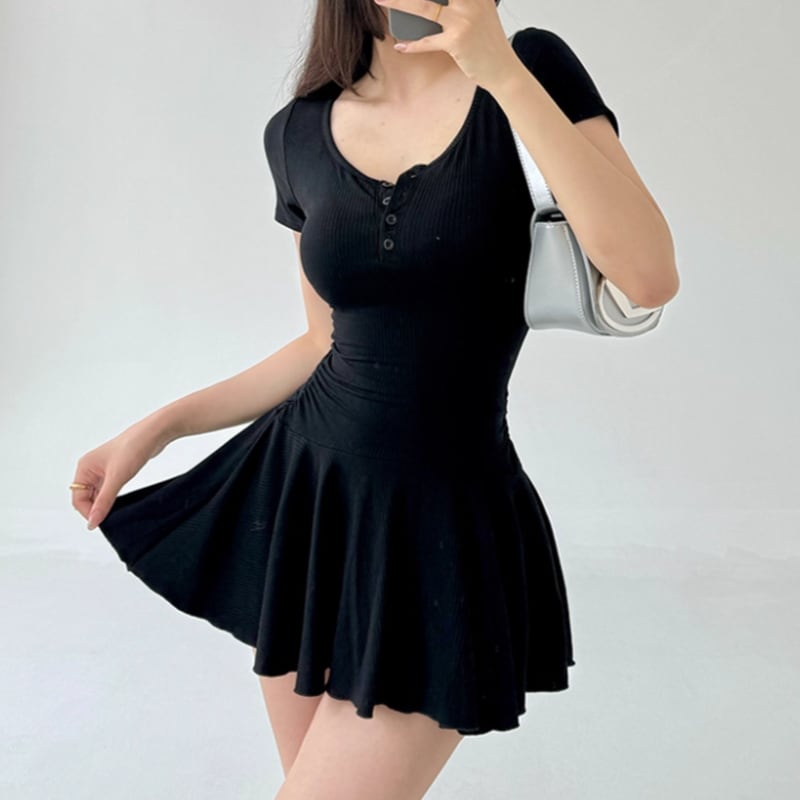 このセットアップは、着心地の良いリブニット素材で仕立てられた、ワンピースとショートパンツの2点セットです。シンプルなラウンドネックと短めの袖丈が、どんなスタイルにも合わせやすいデザイン。ウエスト部分のシェイプとフレアスカートが女性らしさを演出します。ボタンデザインがさりげないアクセントになっています。一枚で着ても、レイヤードスタイルにも対応できる万能アイテムです。お出かけからリラックスシーンまで、幅広いシーンで活躍します。