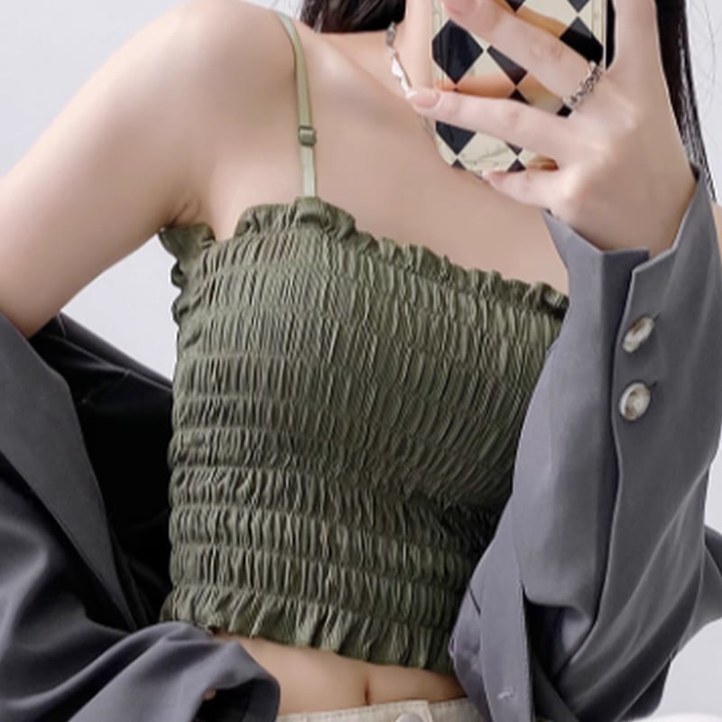 すっきりとしたシルエットのクロップドキャミソール。細めのストラップと、シャーリングデザインが女性らしい印象を与えます。カジュアルなスタイルにも、ジャケットを羽織ってきれいめな装いにも合わせやすく、着回し力抜群の一枚です。様々なボトムスと相性も良く、普段使いから特別な日まで活躍します。