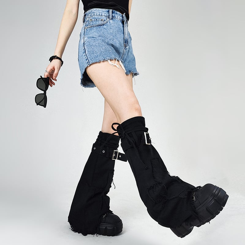 カジュアルからストリートスタイルまで幅広く対応できる、デニム生地のロングブーツカバー。フリンジとベルトが、着こなしにアクセントを添えてくれます。ブーツカバーを着用するだけで、簡単にスタイリングの幅を広げることができます。個性を際立たせたい方におすすめです。