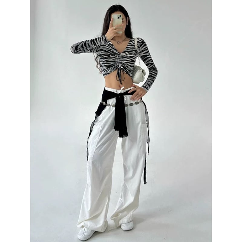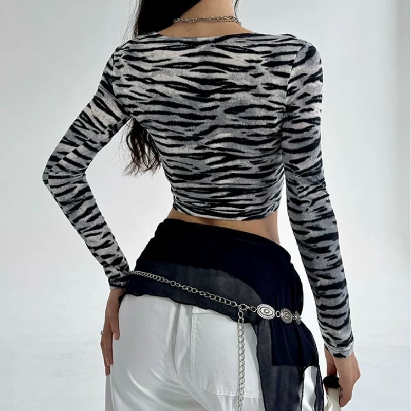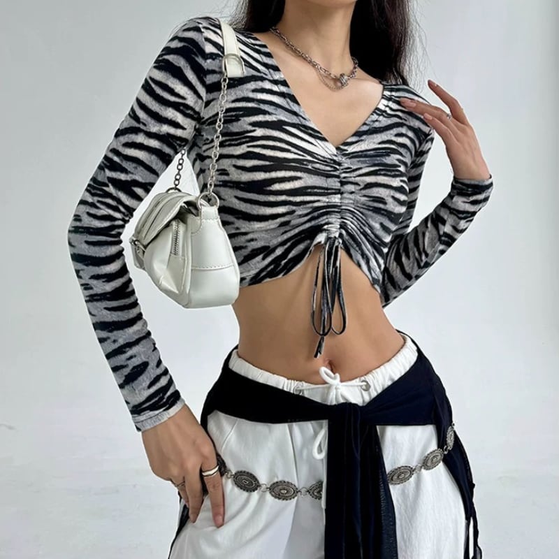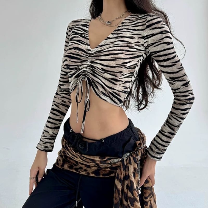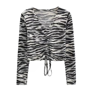 ゼブラ柄がコーディネートにインパクトを与え、存在感のあるスタイルを演出します。