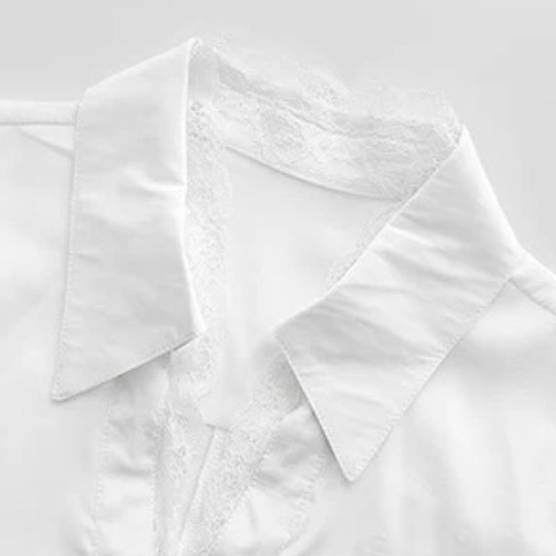襟元にあしらわれた繊細なレースがアクセントになり、上品な雰囲気をプラス。