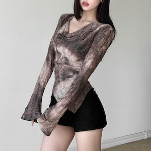 タイダイカラーとアシンメトリーな裾のデザインがシンプルながらも目を惹くトップスです。