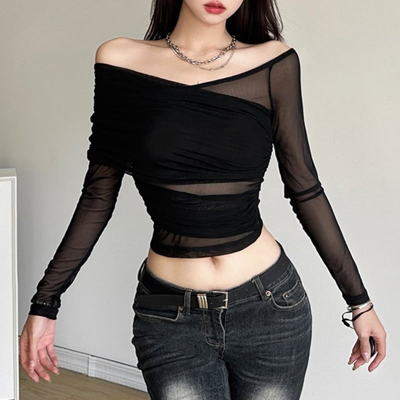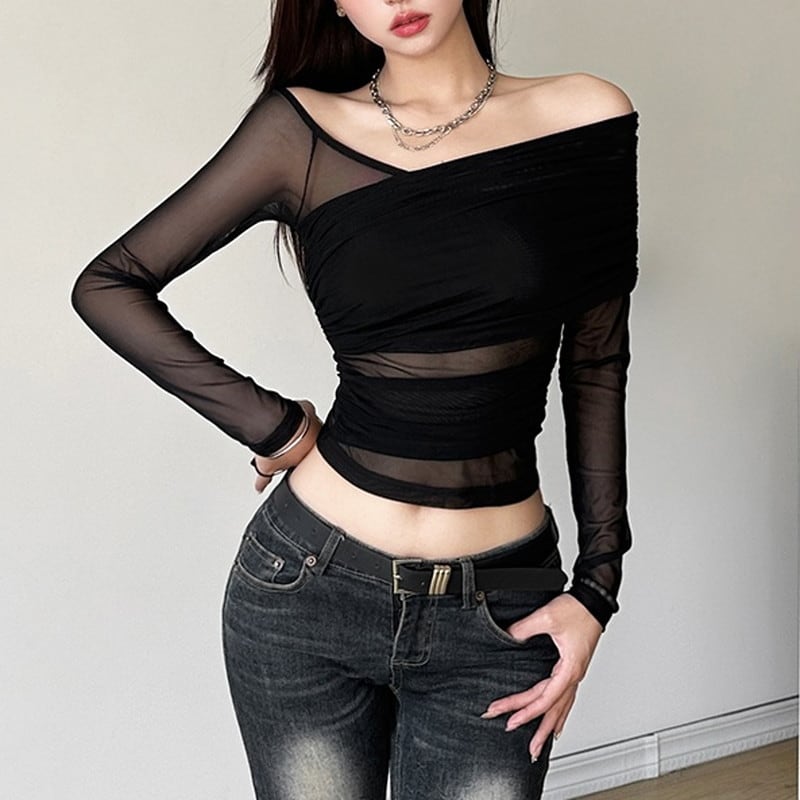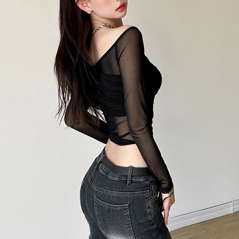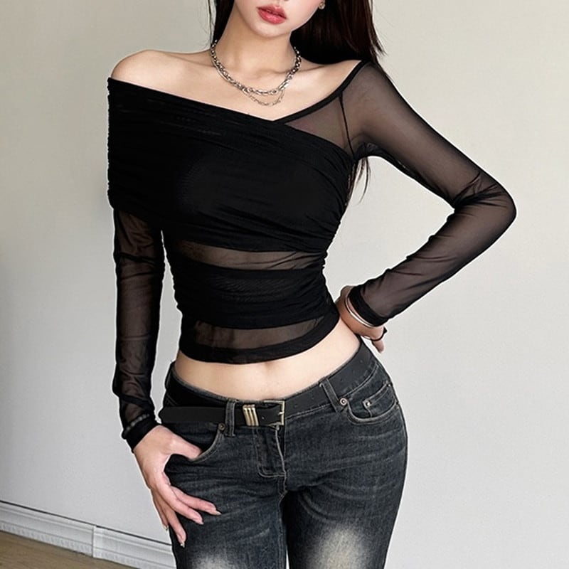 メッシュ素材が透け感を演し、肌見せが控えめなので様々なスタイリングに合わせやすく着こなしの幅が広がります。