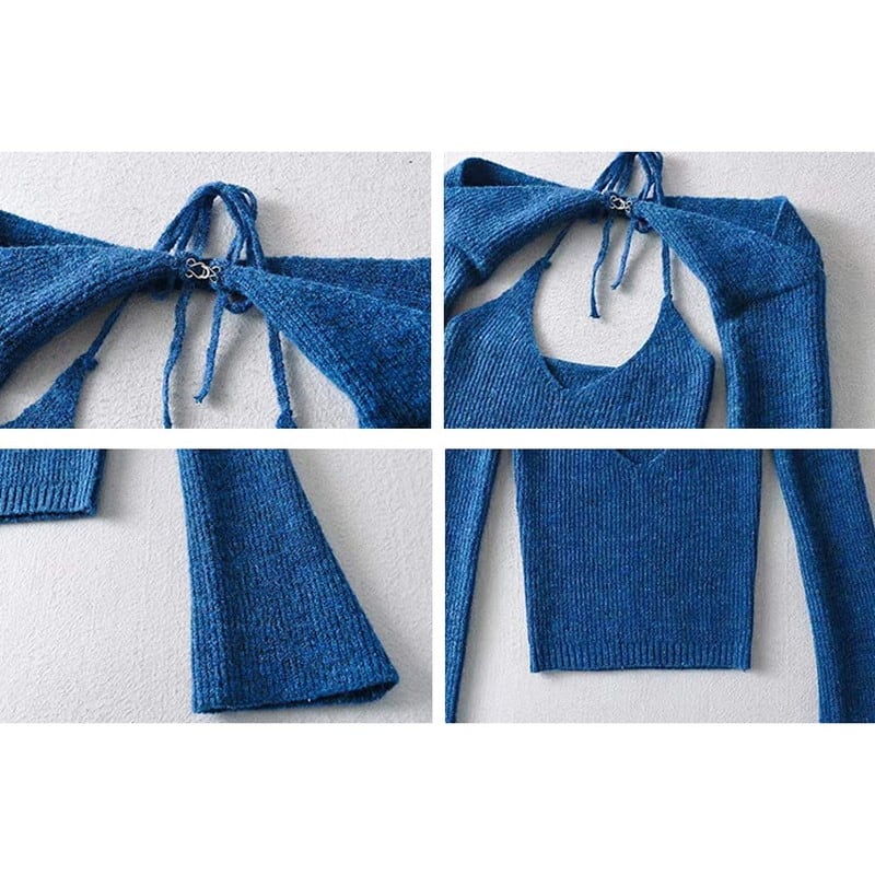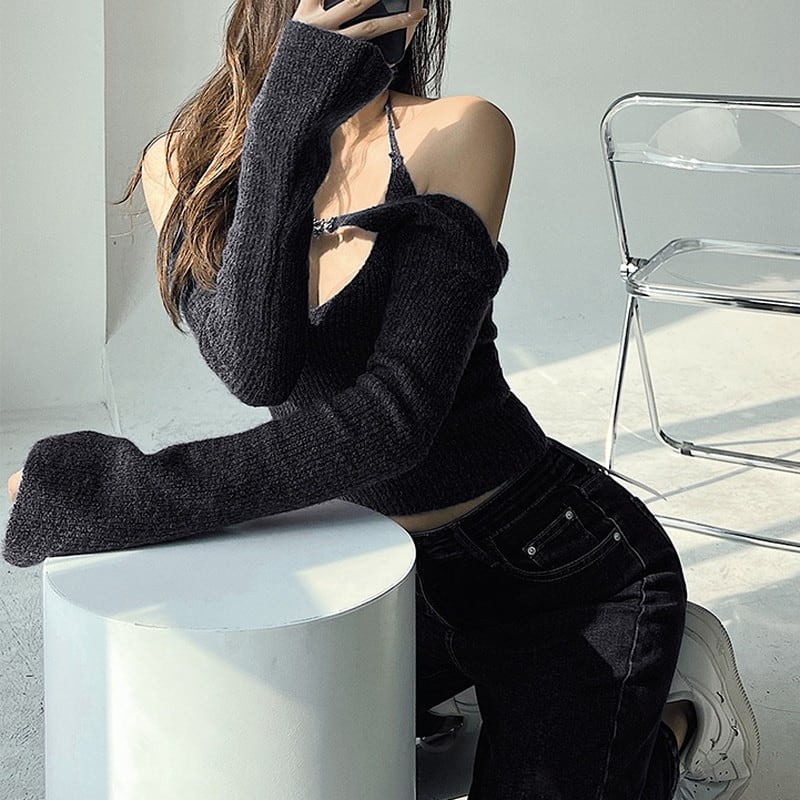 オフショルダーデザインとVネックが女性らしい魅力を引き立てる個性的なクロップド丈ニットです。
