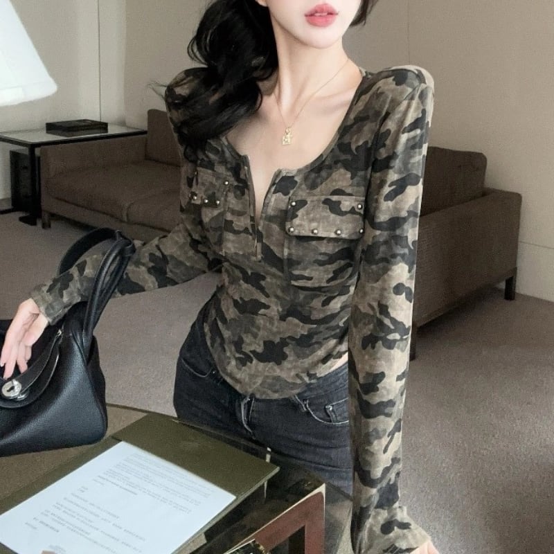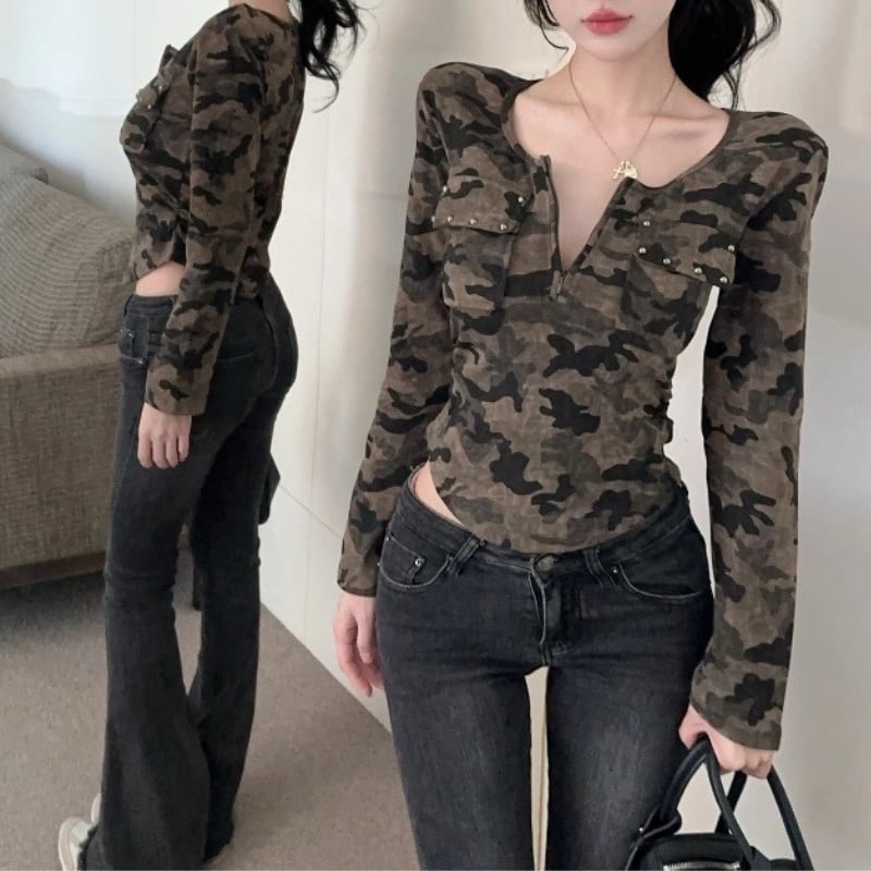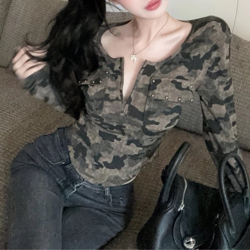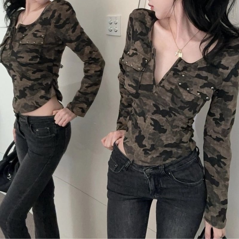 迷彩柄が目を引くロングスリーブトップです。