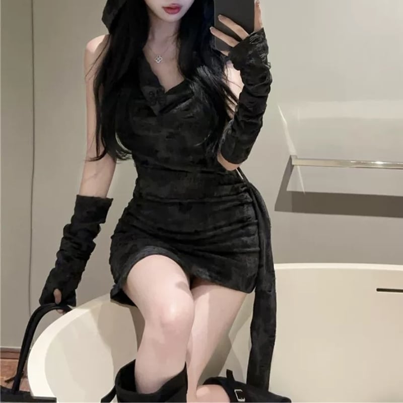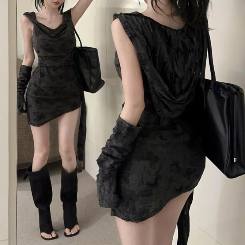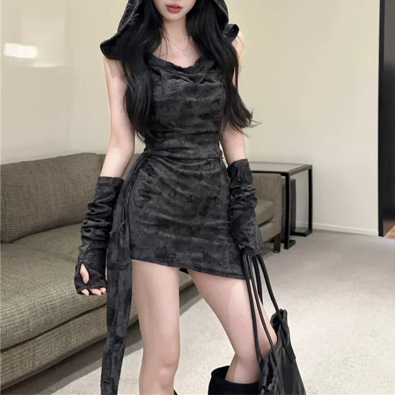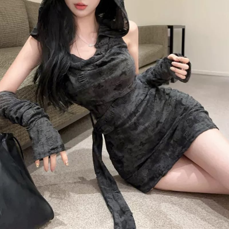 ロング丈のアームカバーがセットになり、存在感のあるスタイルを完成させる一枚です。