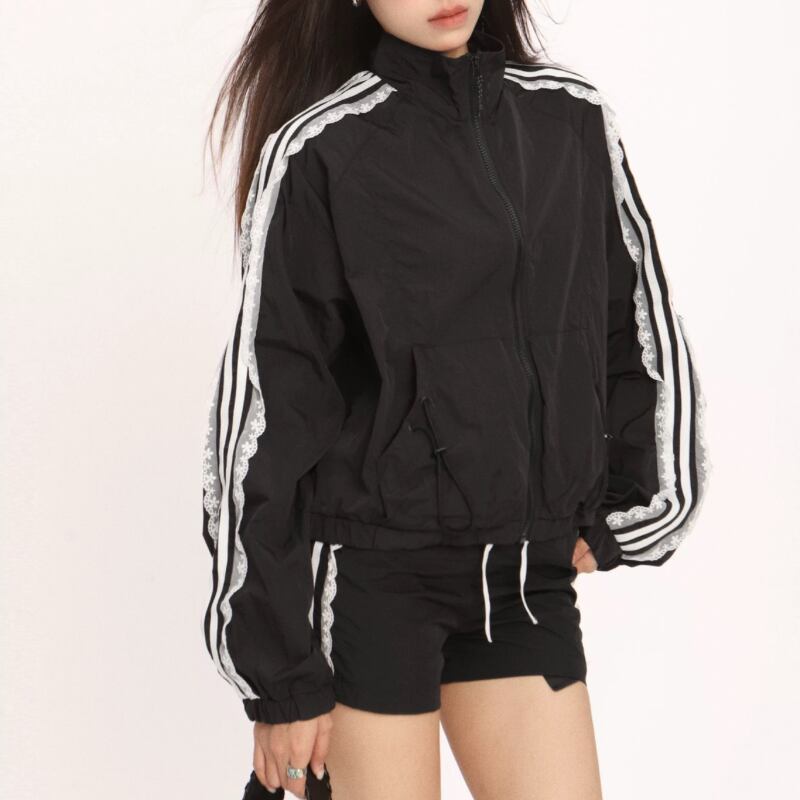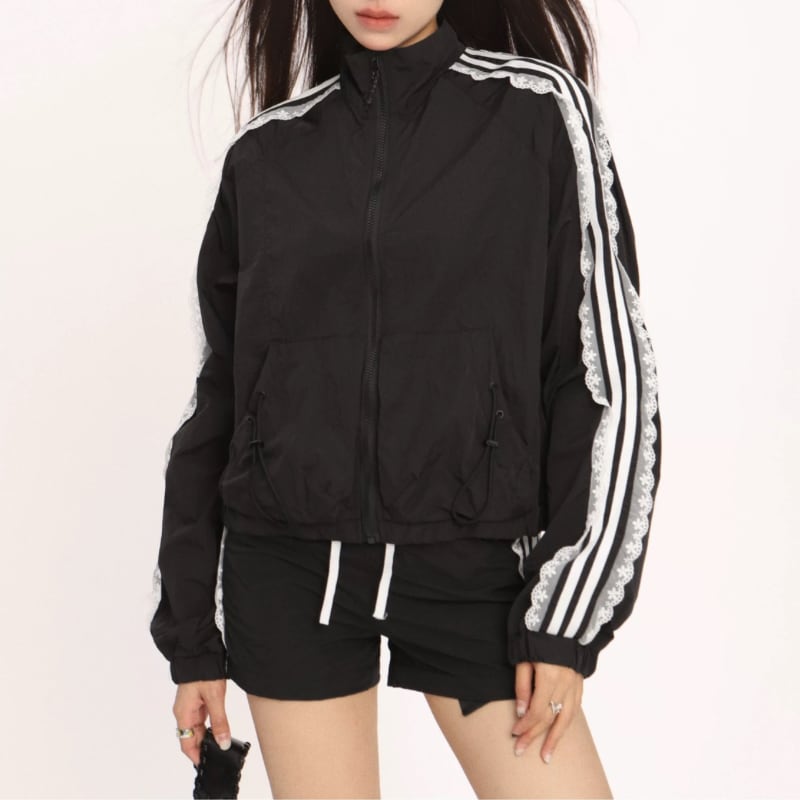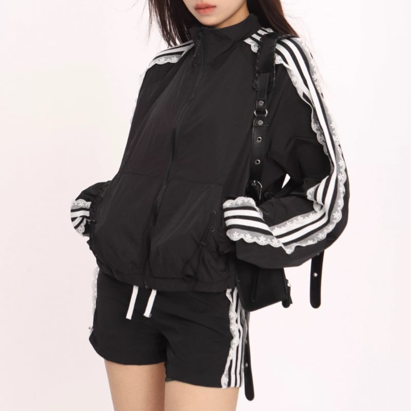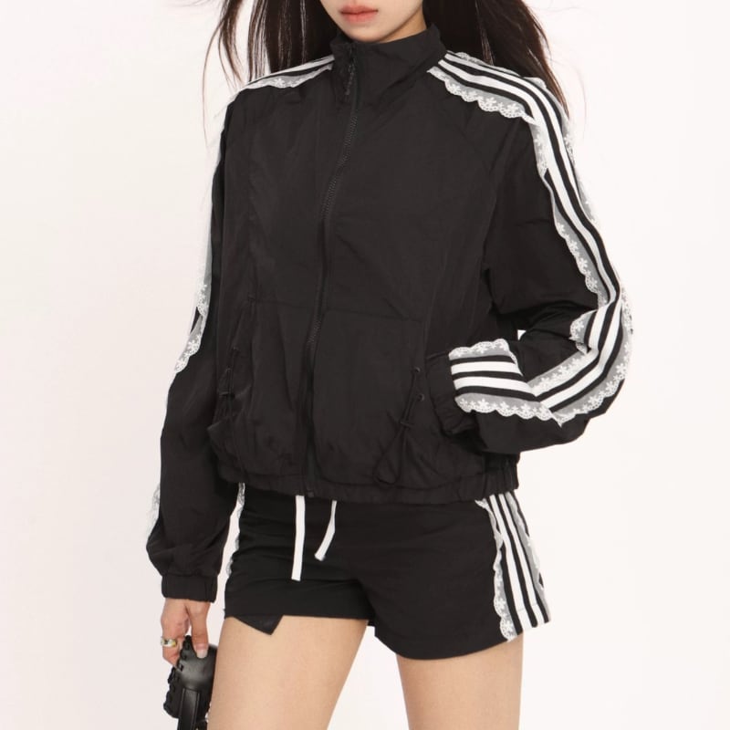 袖のラインにレースをあしらったスポーティなセットアップ。