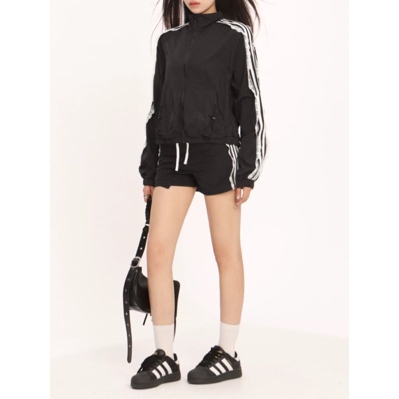 ジャケットとショートパンツの組み合わせで、ストリート感とフェミニンさを両立します。
