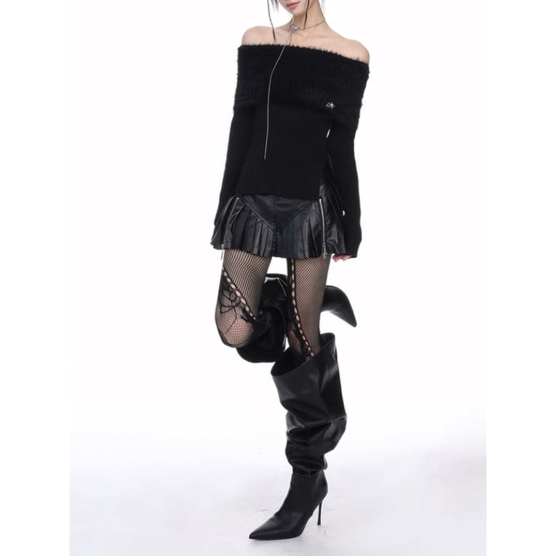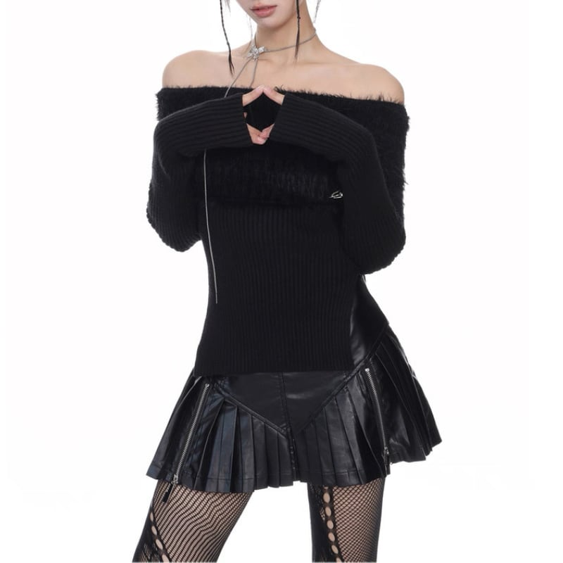 ふわっとしたファーディテールをあしらったオフショルダーニット。