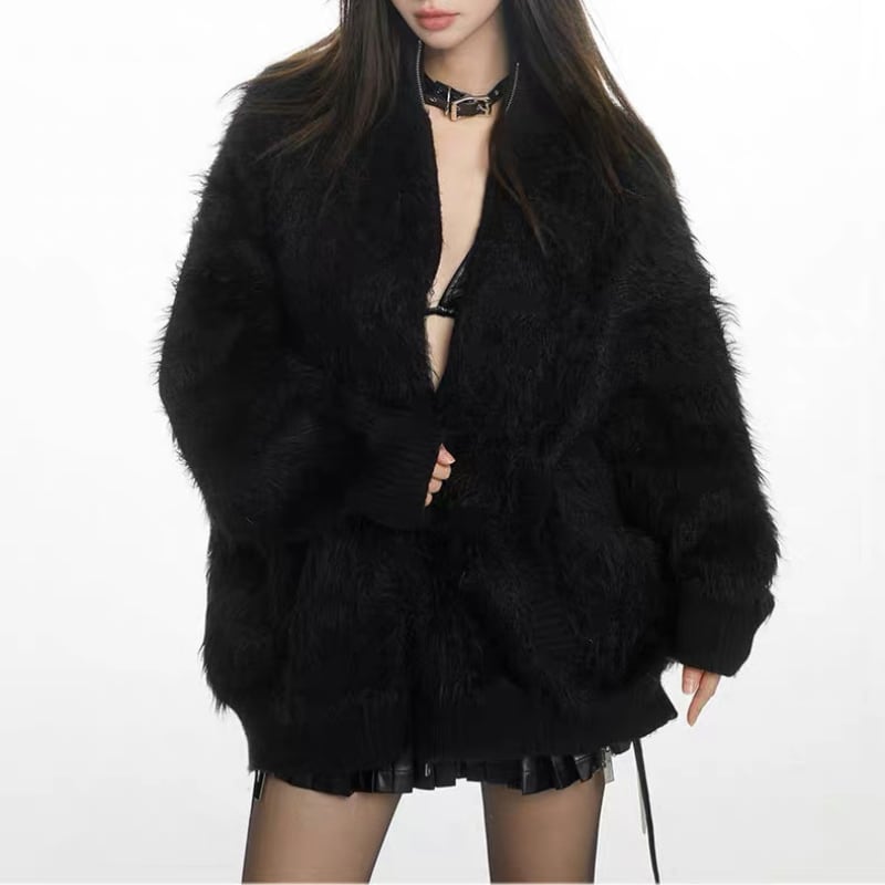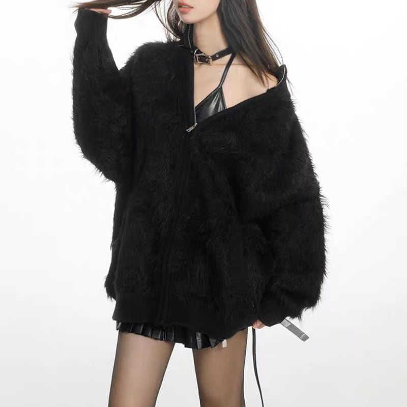 柔らかいファー調素材で仕上げたジップカーディガン。