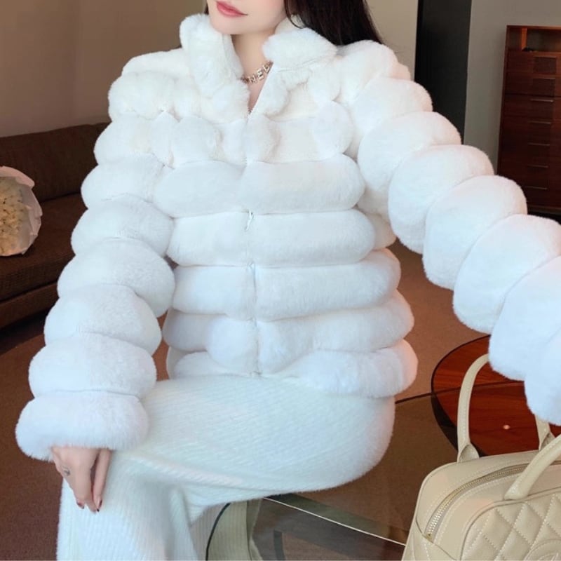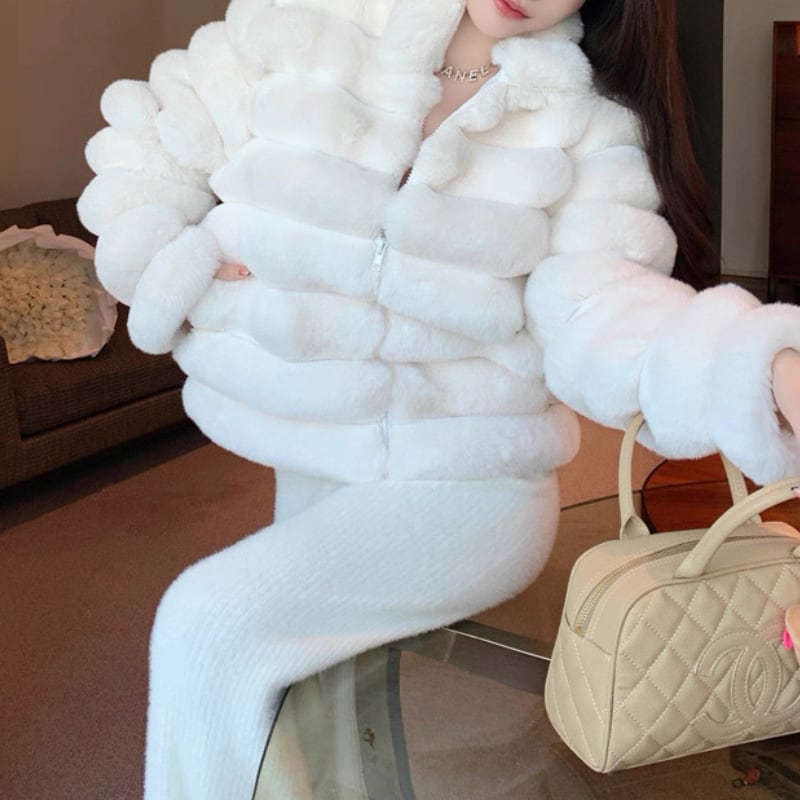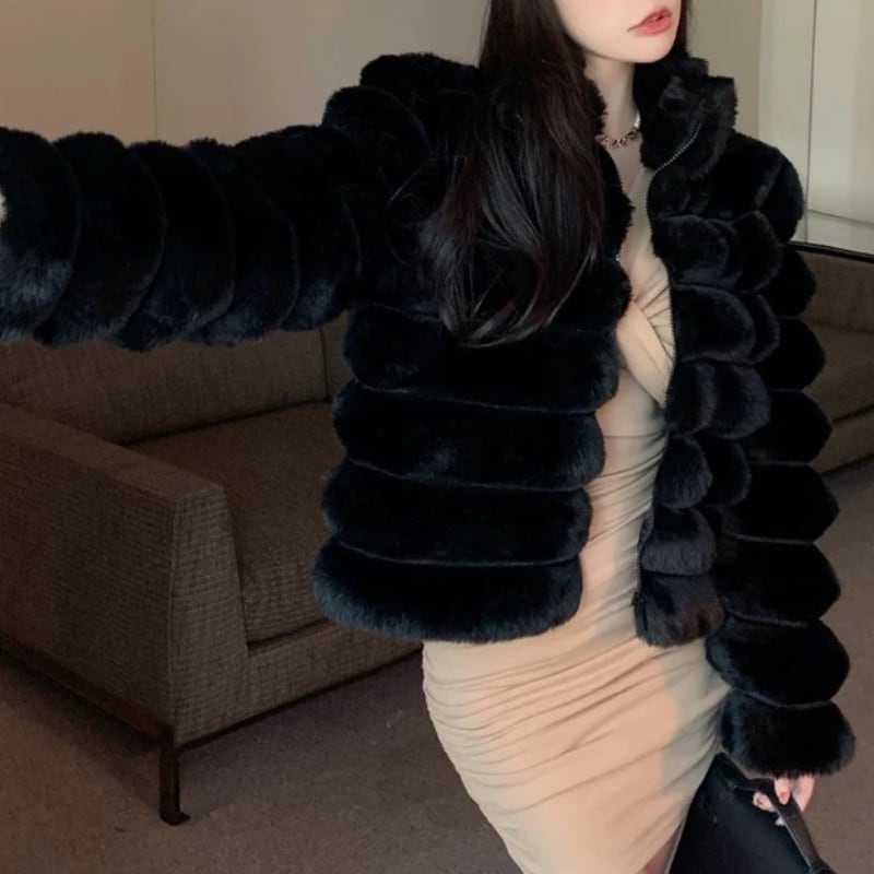 立体感のあるパネルデザインが印象的なフェイクファージャケット。