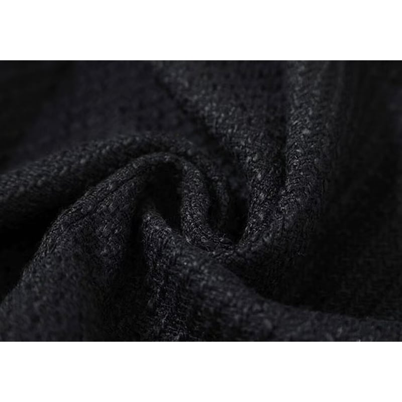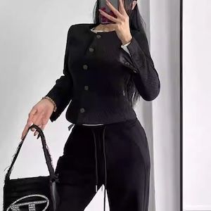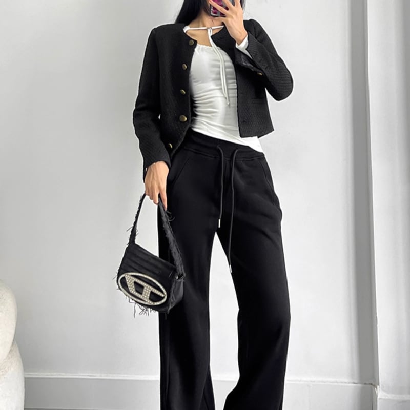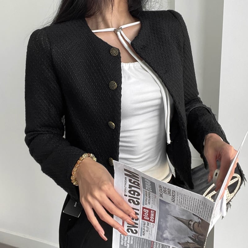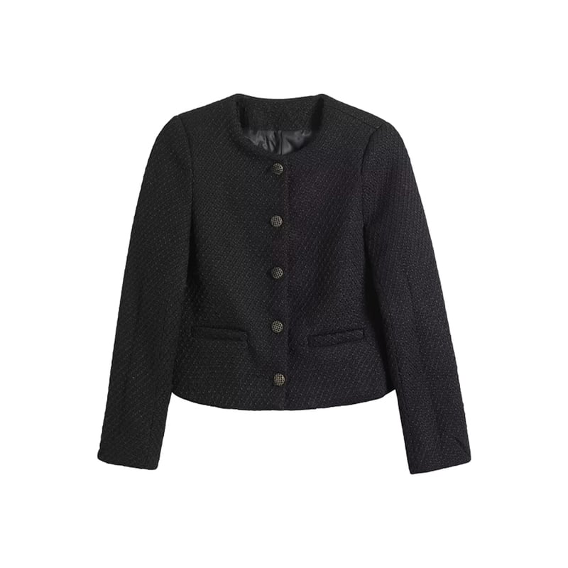 上品なノーカラージャケットです。ウエスト丈のコンパクトなデザインで、スタイルアップ効果も期待できます。フロントボタンがアクセントとなり、様々なコーディネートに合わせやすい一枚です。普段使いから、少しフォーマルな装いにもおすすめです。