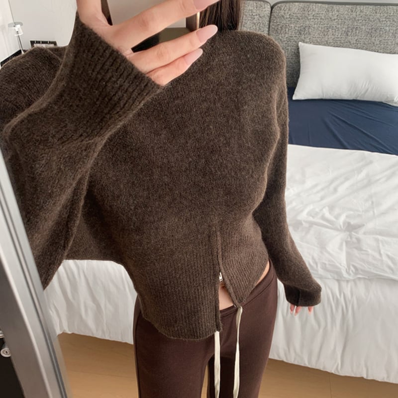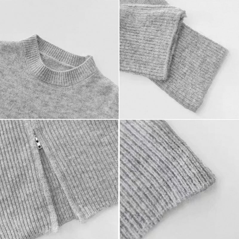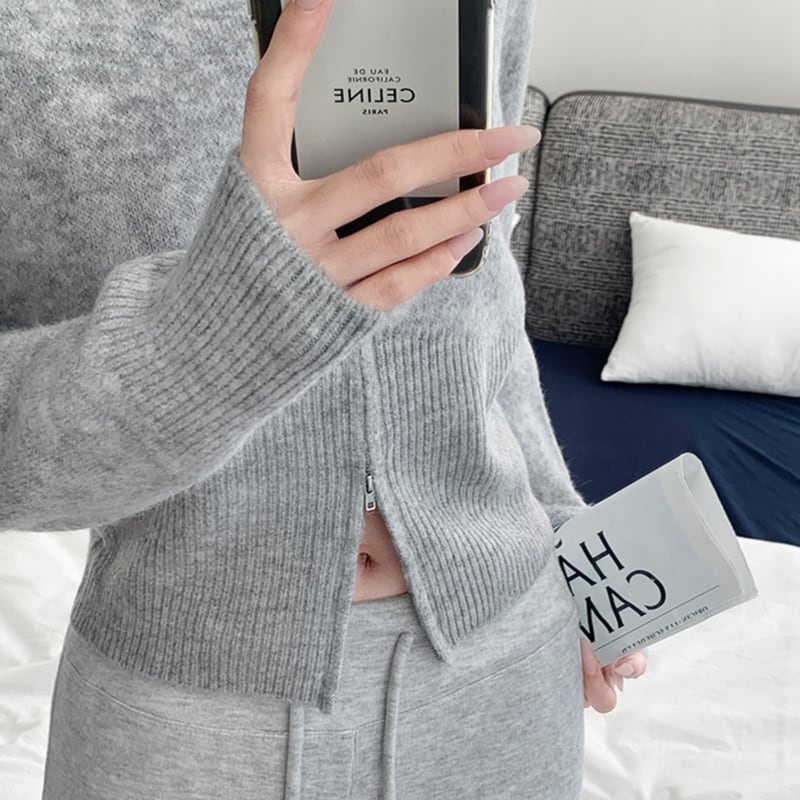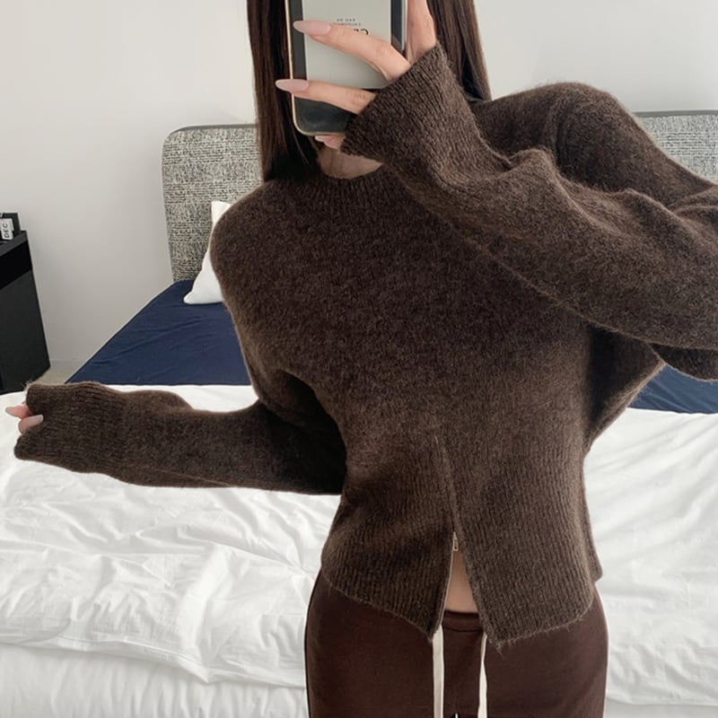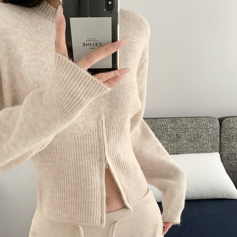 ふんわりとした編地に、裾のリブ切り替えとフロントのスリットジップを合わせたデザインです。