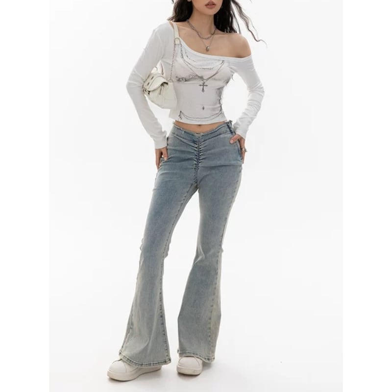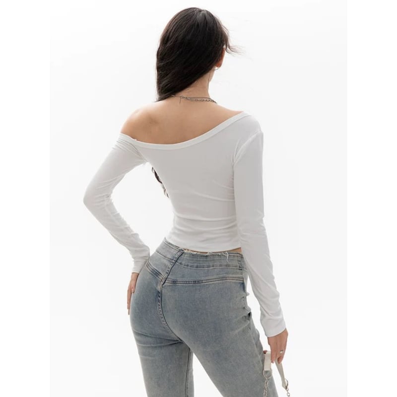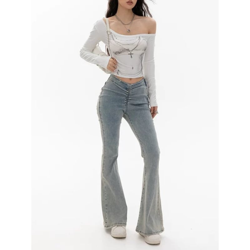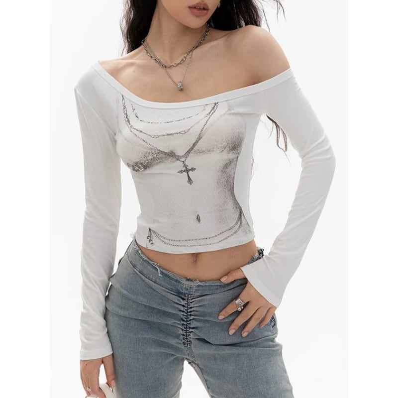 ボディのプリントが目を引く、タイトシルエットのオフショルダートップスです。