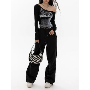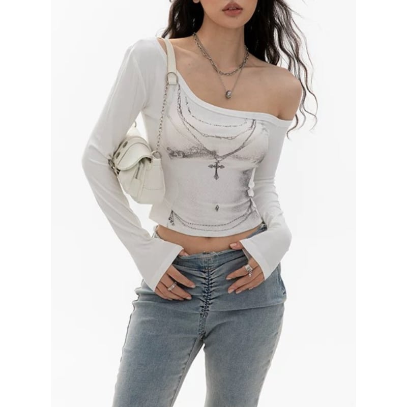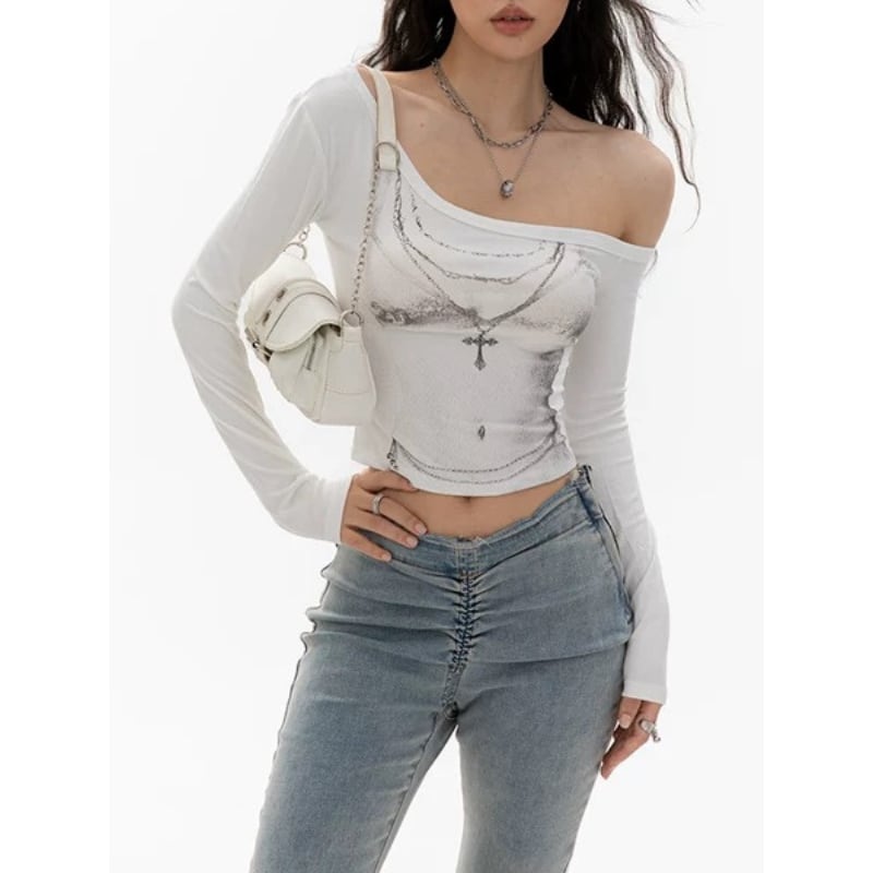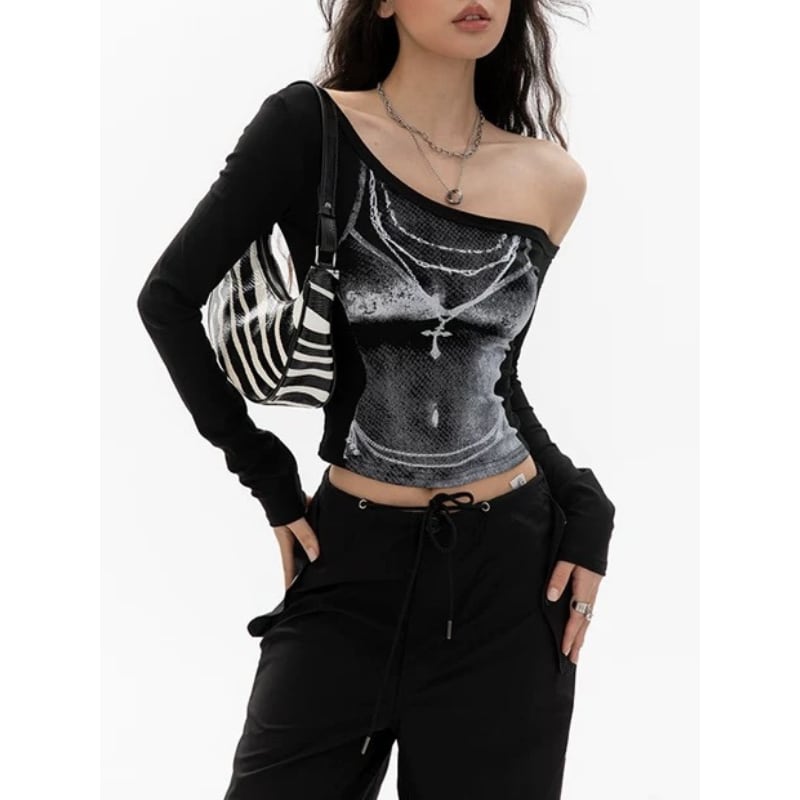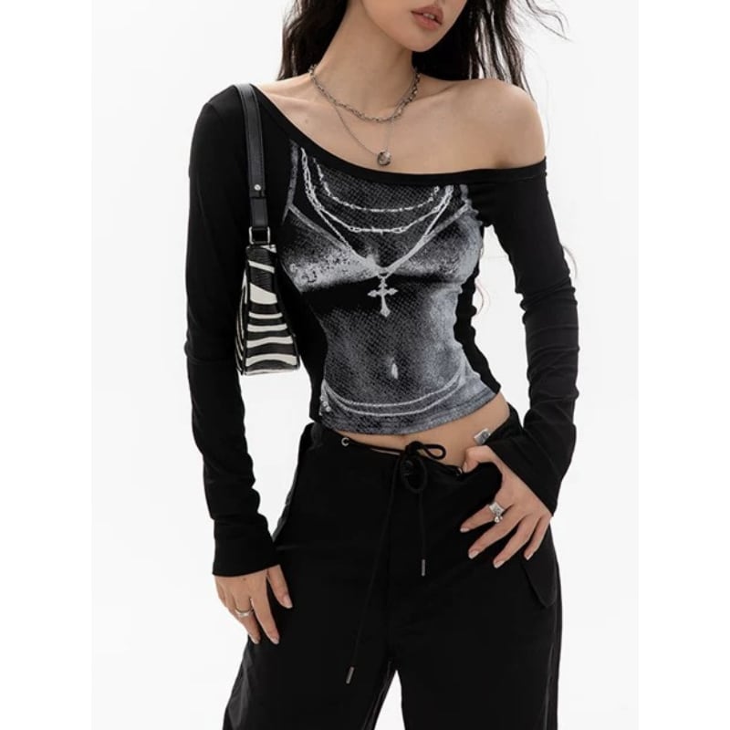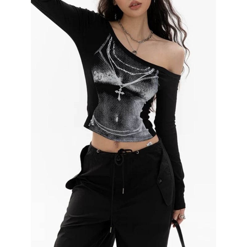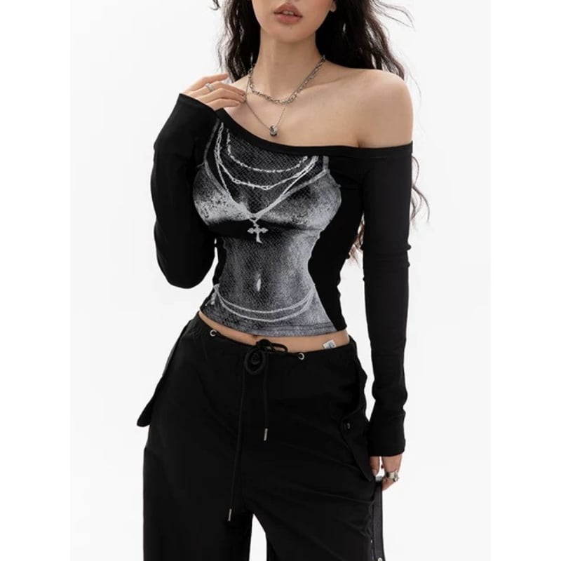 プリントはクロスモチーフのネックレスやボディラインを表現しており、個性的でクールな印象を与えます。