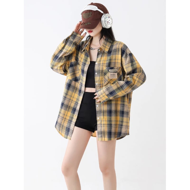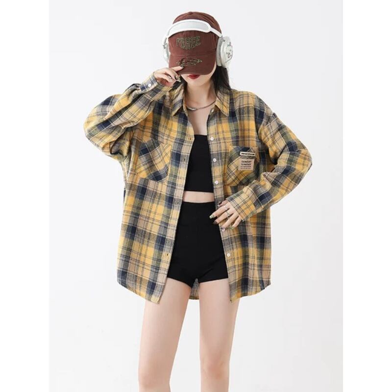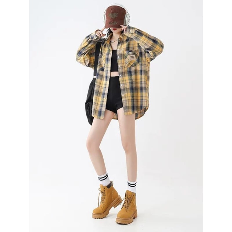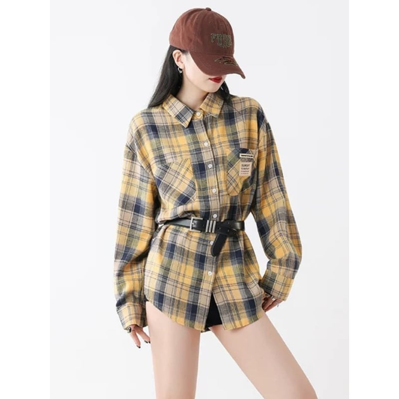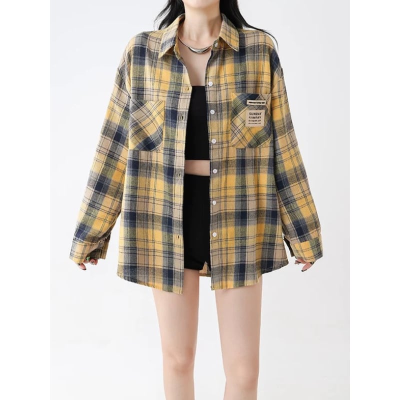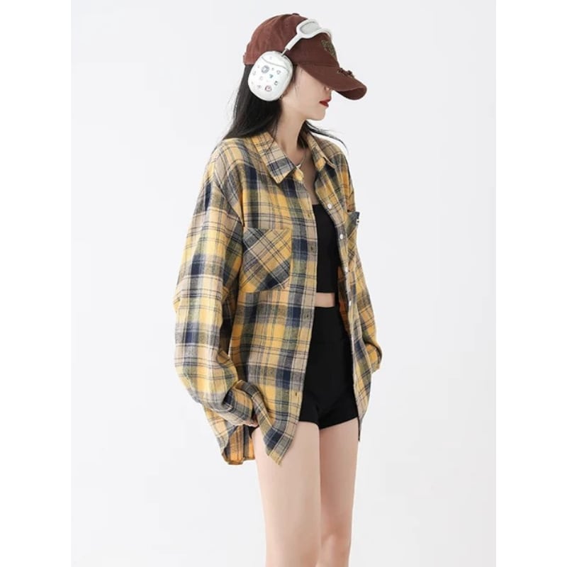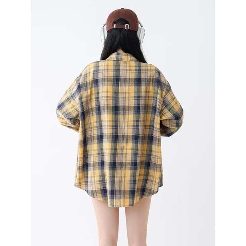 イエローを基調にしたチェック柄が着こなしのポイントになるオーバーサイズシャツです。
