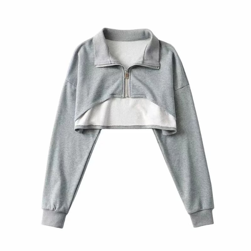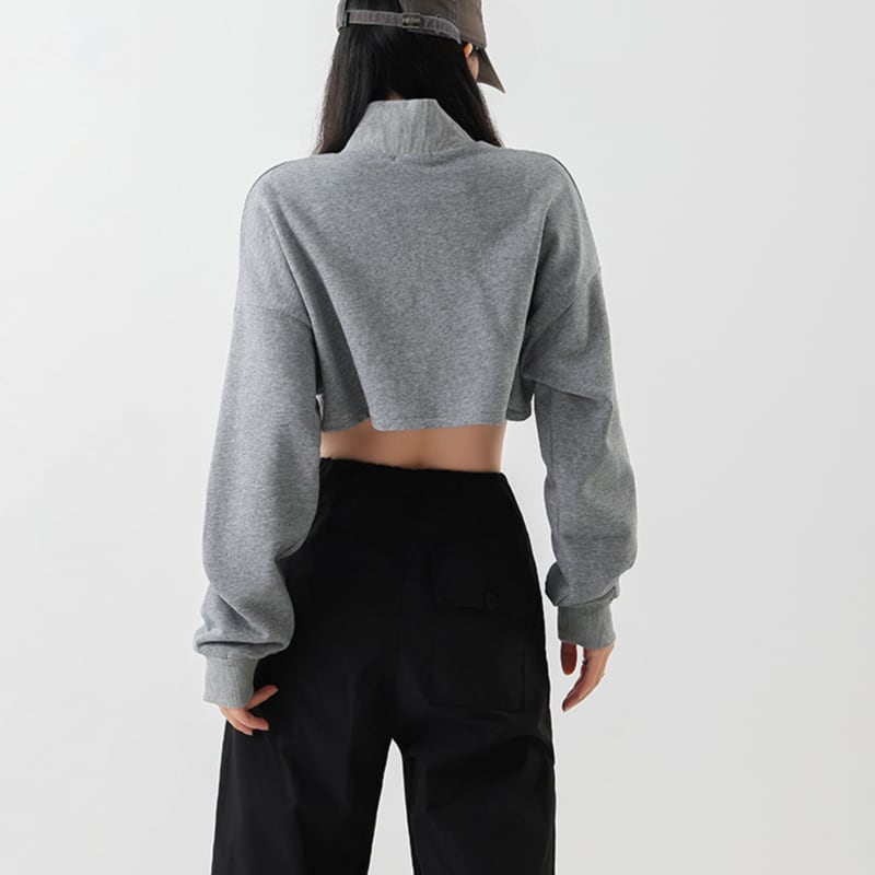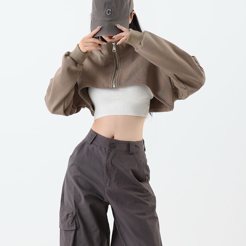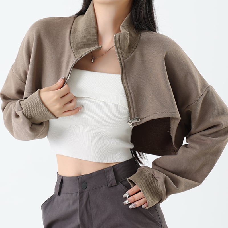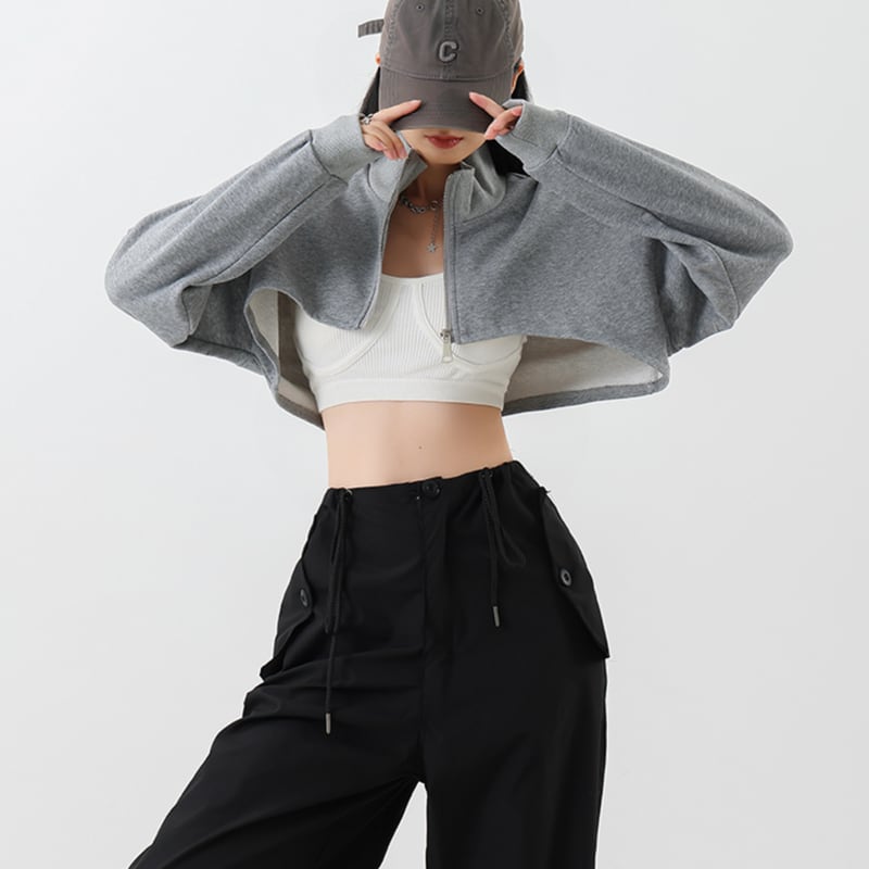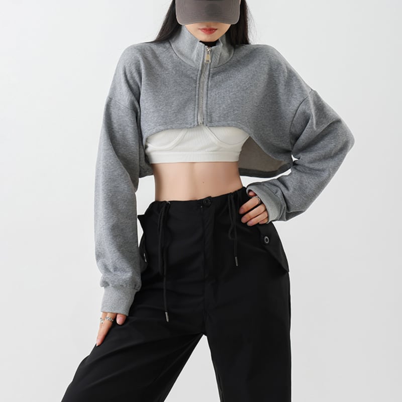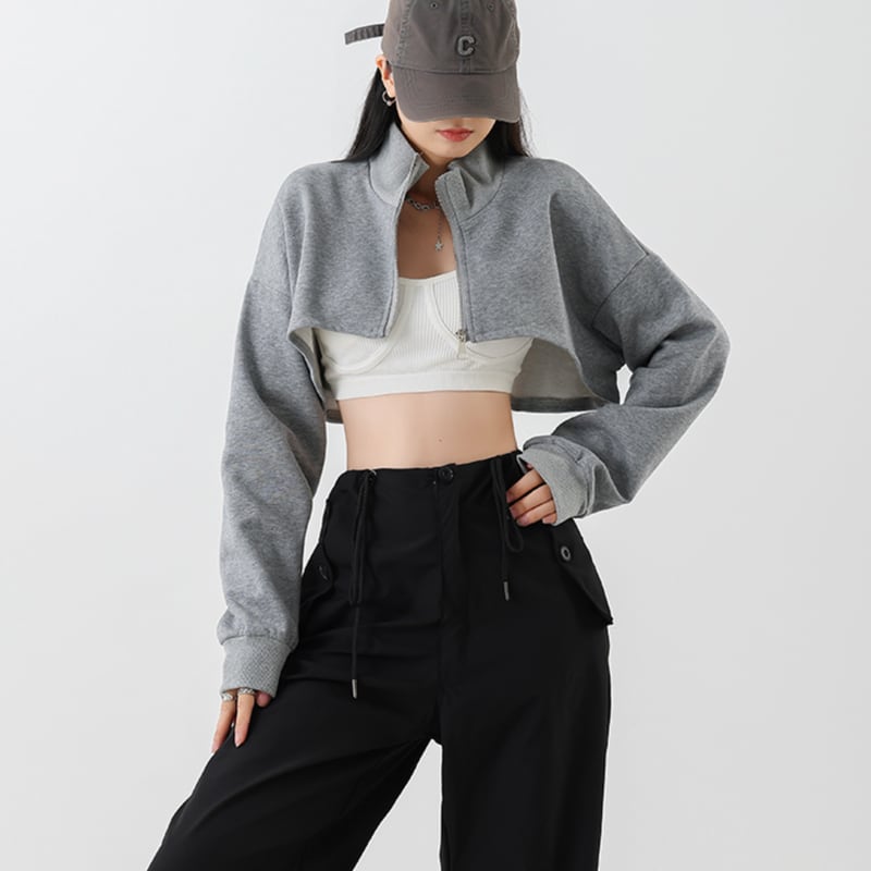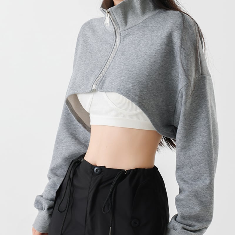 ショート丈のデザインが特徴的な、長袖のジップアップスウェットシャツです。