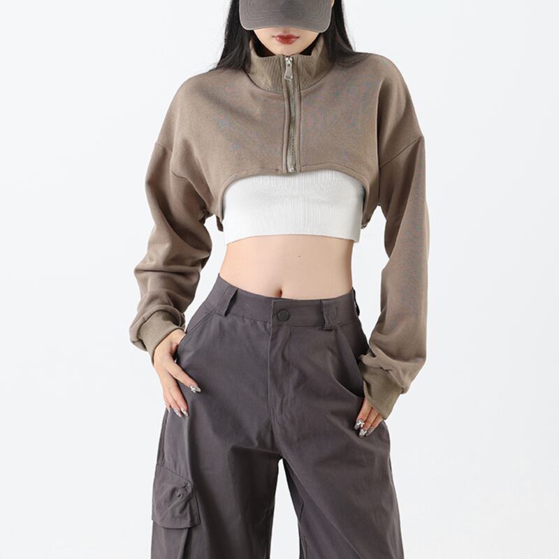 インナーのクロップドトップスやキャミソールと合わせることで、トレンド感のあるストリートカジュアルスタイルが完成します。