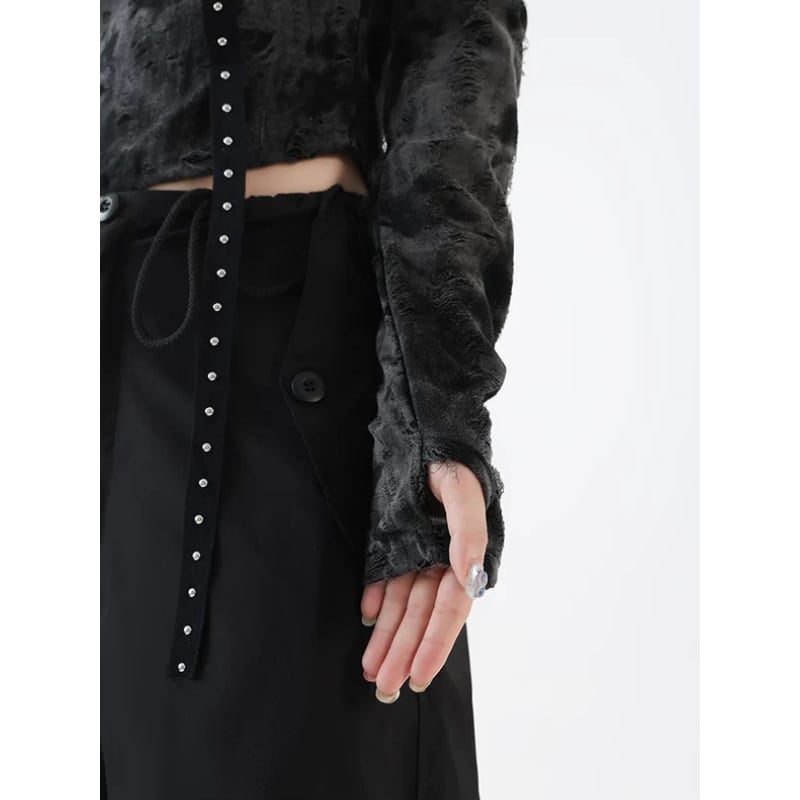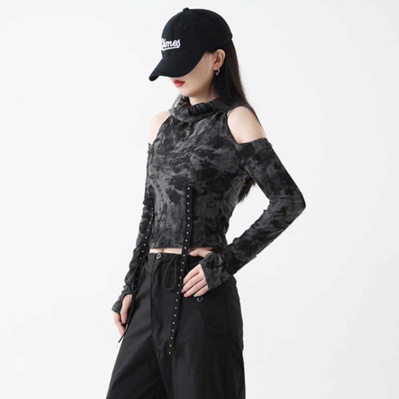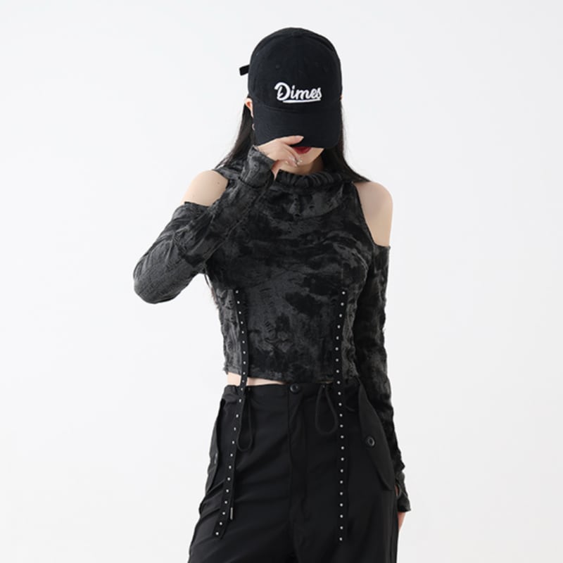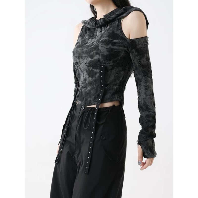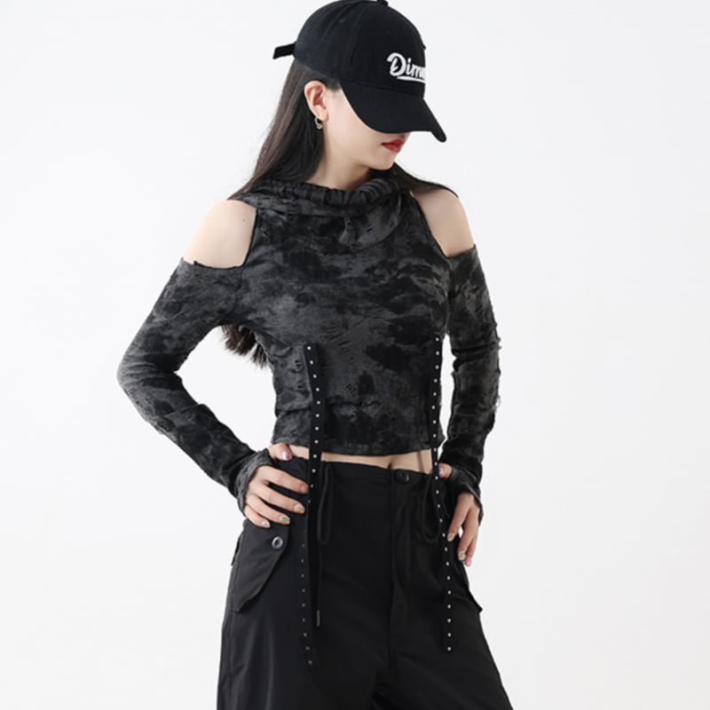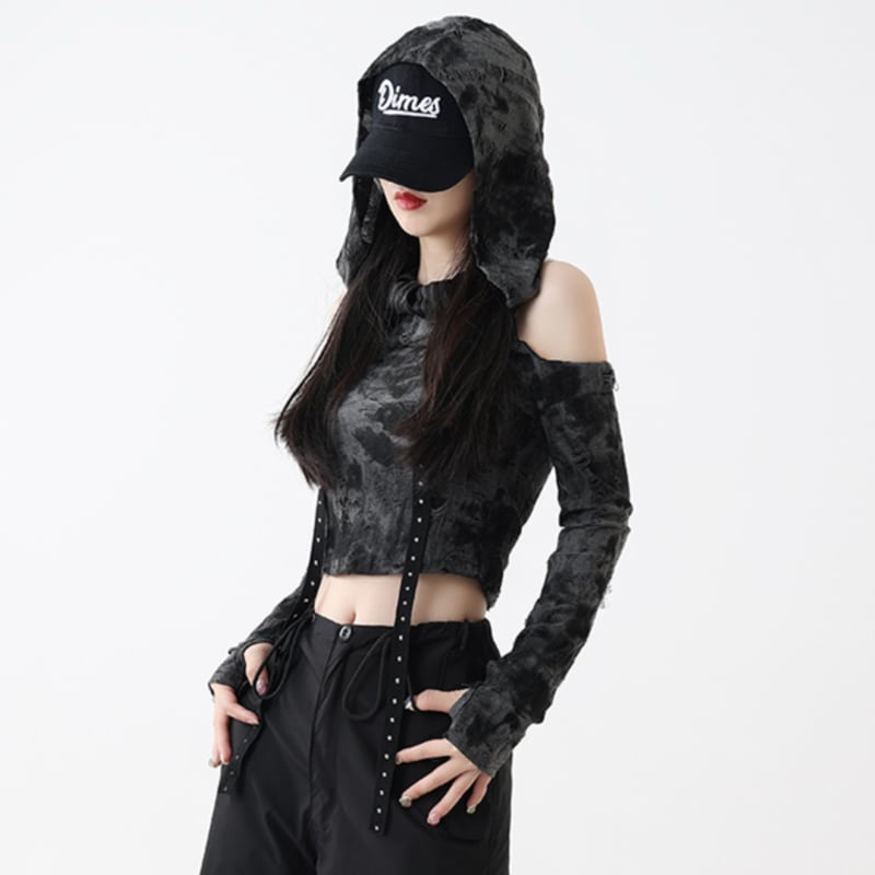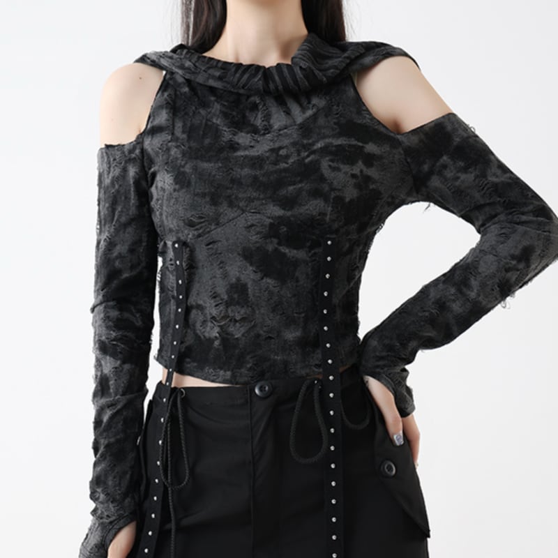 ムラ感のある生地を使い、肩にカットアウトを入れたクロップ丈のフーディーです。