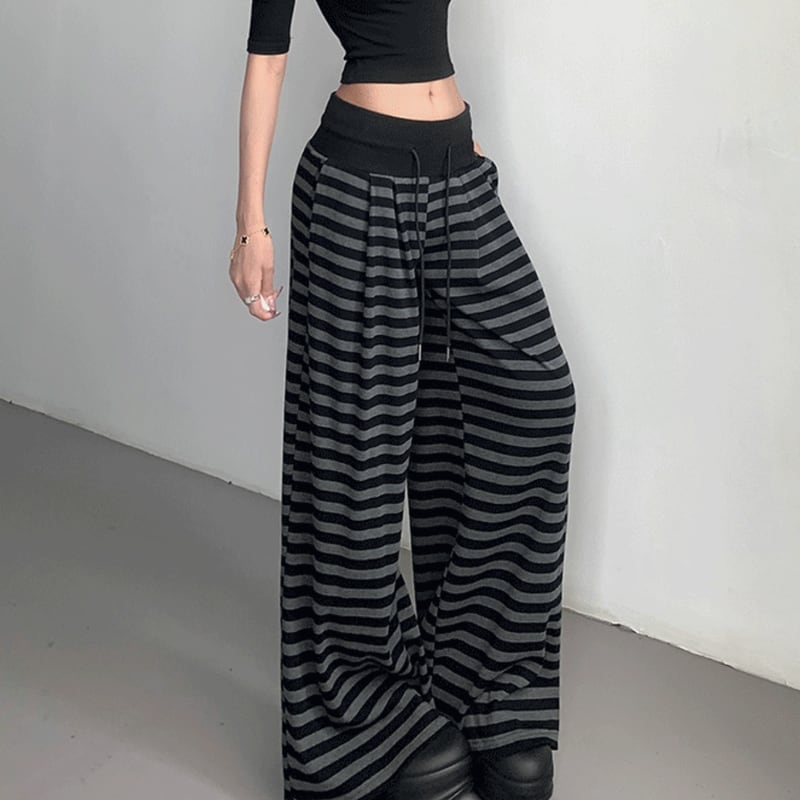 ボーダー柄を全面に取り入れた、ワイドシルエットのパンツ。