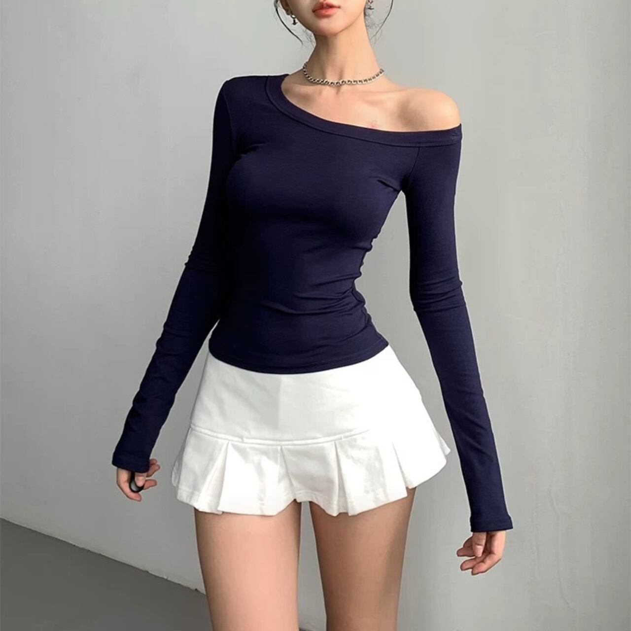 肩を落としたネックラインが特徴の、シンプルなロングスリーブトップ。