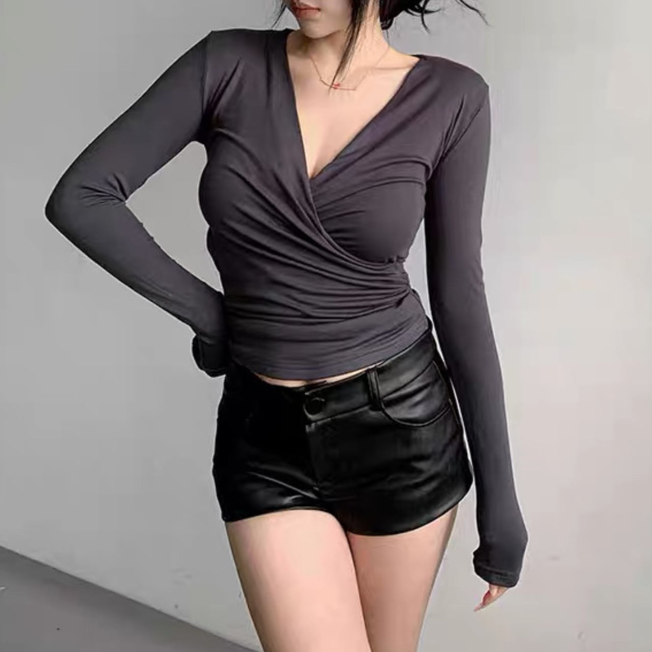 カシュクールデザインが特徴の、フィット感のあるロングスリーブトップ。
