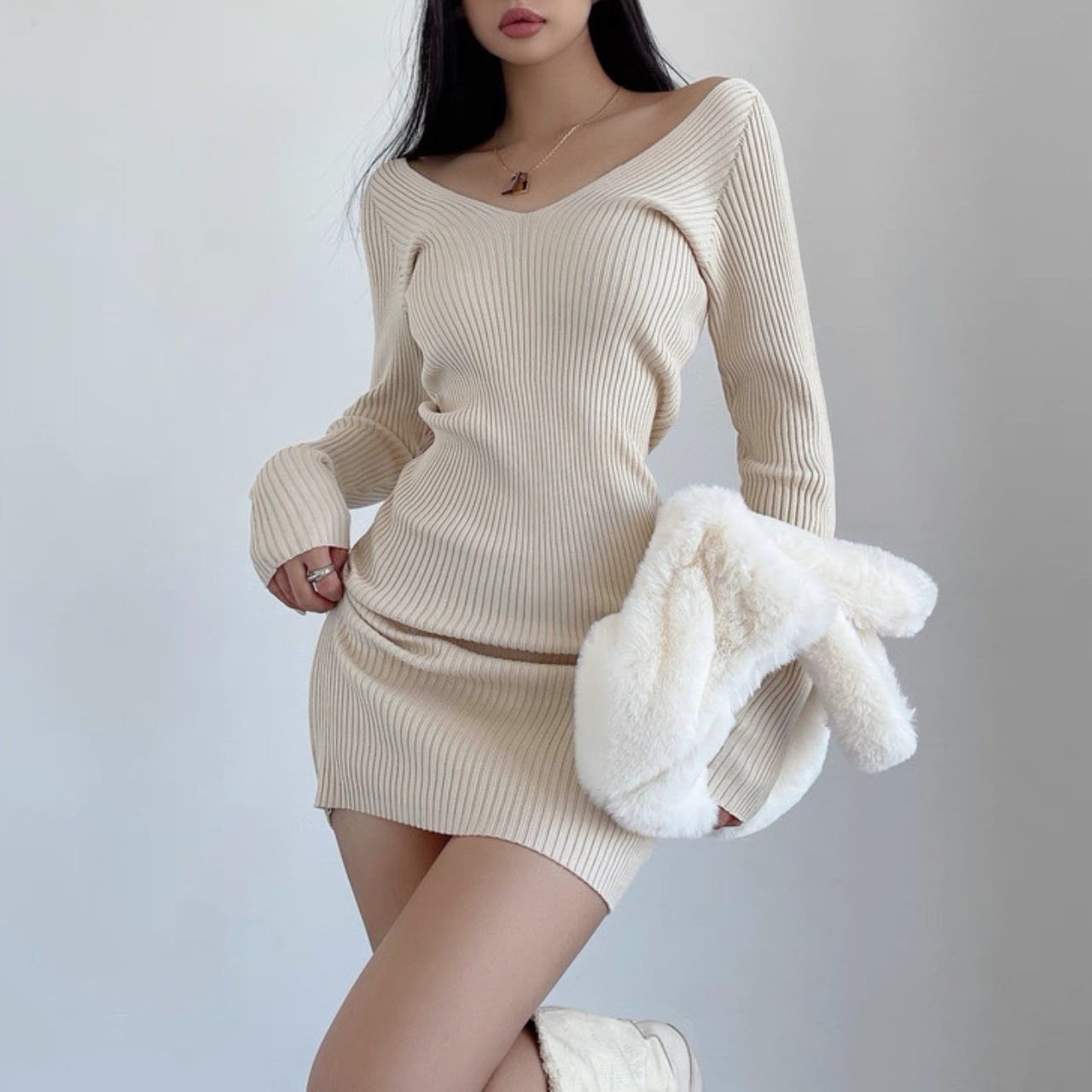 デコルテをきれいに見せるオフショルデザインのニットワンピース。