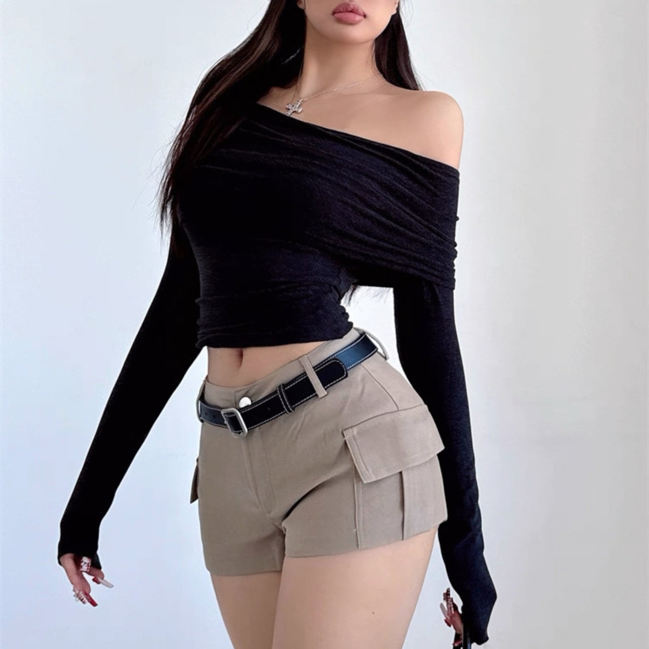 ワンショルダーデザインが視線を引き寄せるトップス。