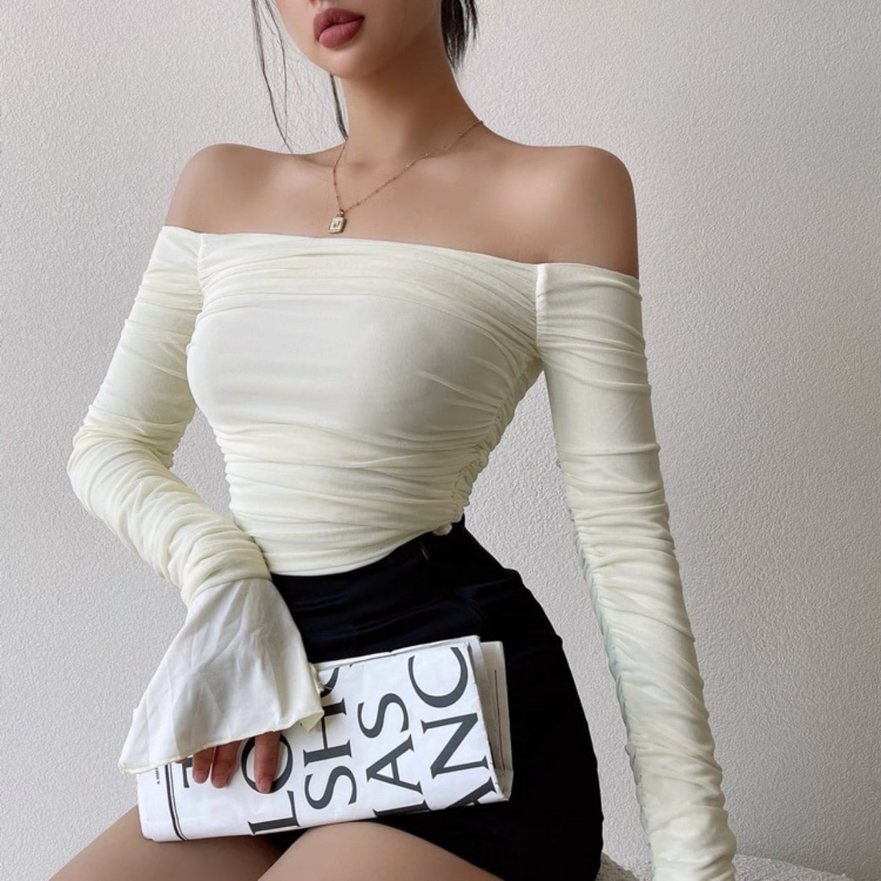 off shoulder ruched long sleeve top la2549