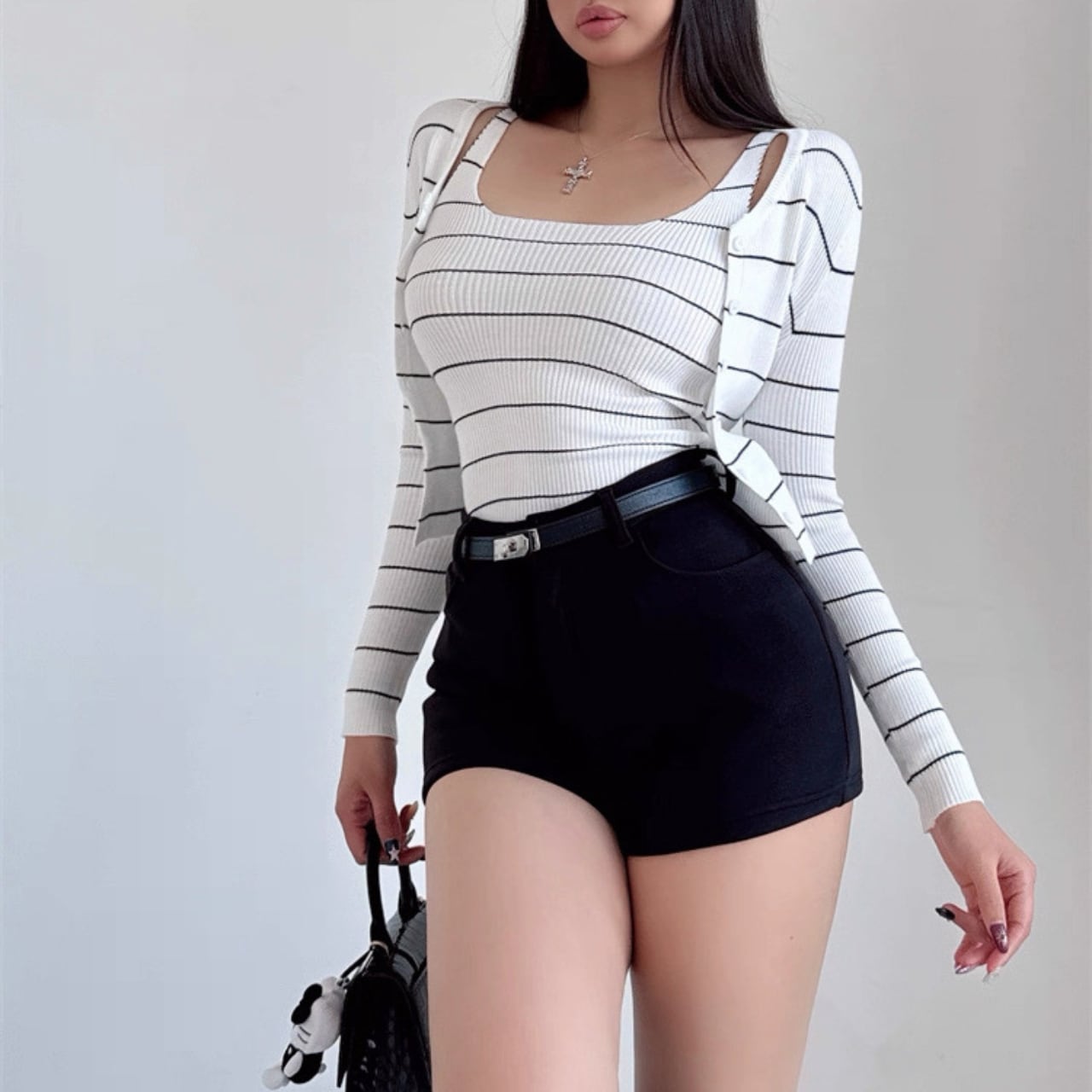 ボーダー柄のタンクトップとカーディガンがセットになったニットアイテム。