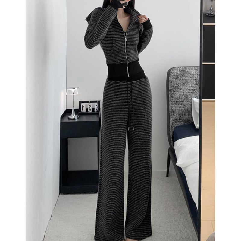 細かなボーダー柄が映える、ジップフーディーとワイドパンツのセットアップ。