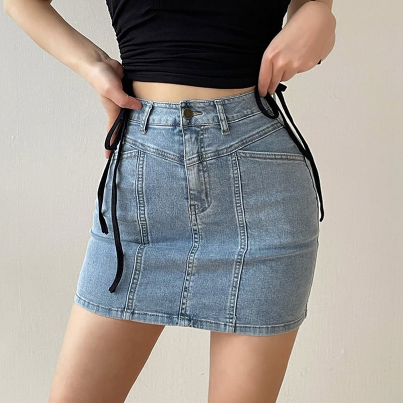 フロントから縦に入った切り替えラインが印象的なデニムスカート。