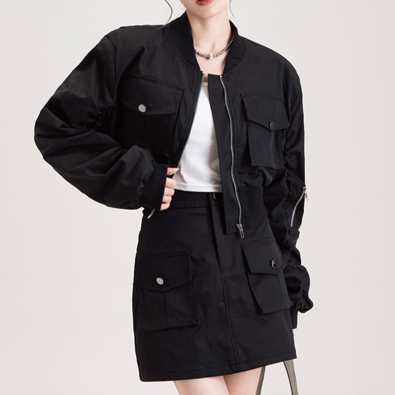 トレンド感のあるショート丈のジップアップジャケットのセットアップ。ワークジャケットをモチーフにしたデザインで、都会的なスタイルを演出。スカートやパンツ、ワンピースなど、どんなアイテムとも相性抜群。着るだけでコーディネートが旬な表情に仕上がります。