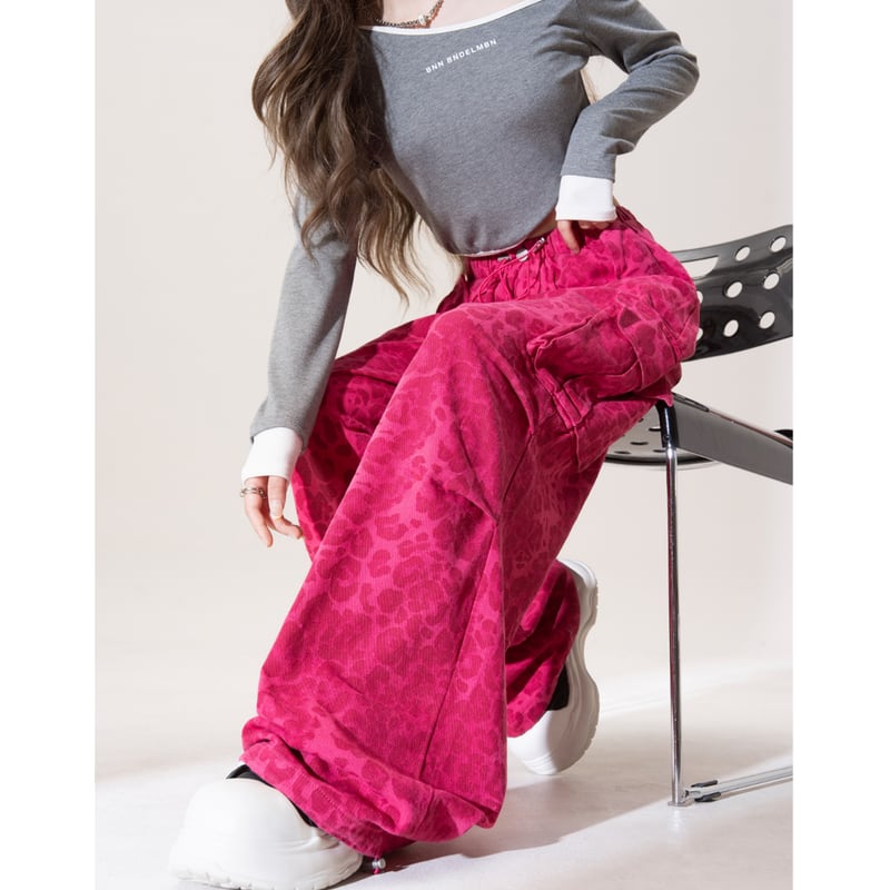 大胆な柄がコーディネートの主役になるワイドカーゴパンツ。